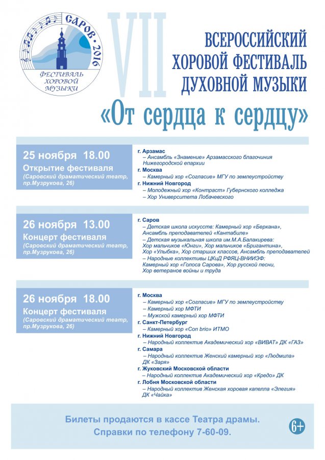 Департамент культуры и искусства приглашает горожан на VII Всероссийский хоровой фестиваль духовной музыки «От сердца к сердцу», который состоится в саровском драматическом театре с 25 по 27 ноября.