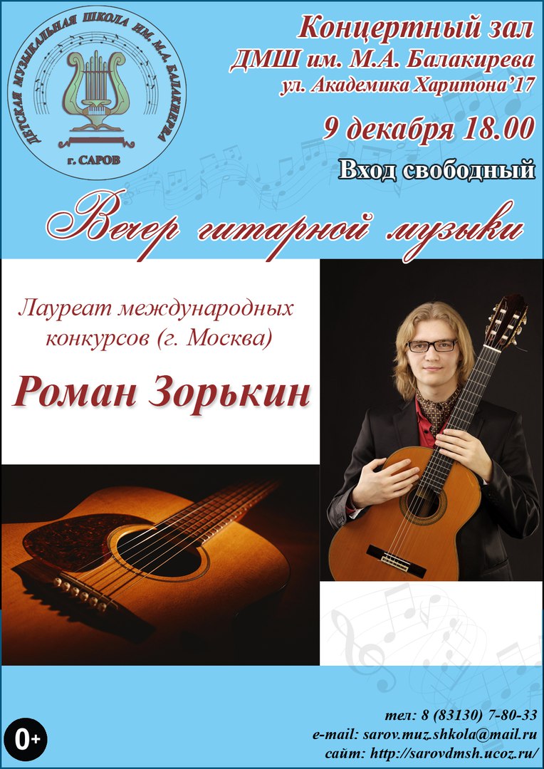 9 декабря в концертном зале ДМШ им. М.А.Балакирева состоится концерт лауреата международных конкурсов Романа Зорькина (гитара) «Вечер гитарной музыки».