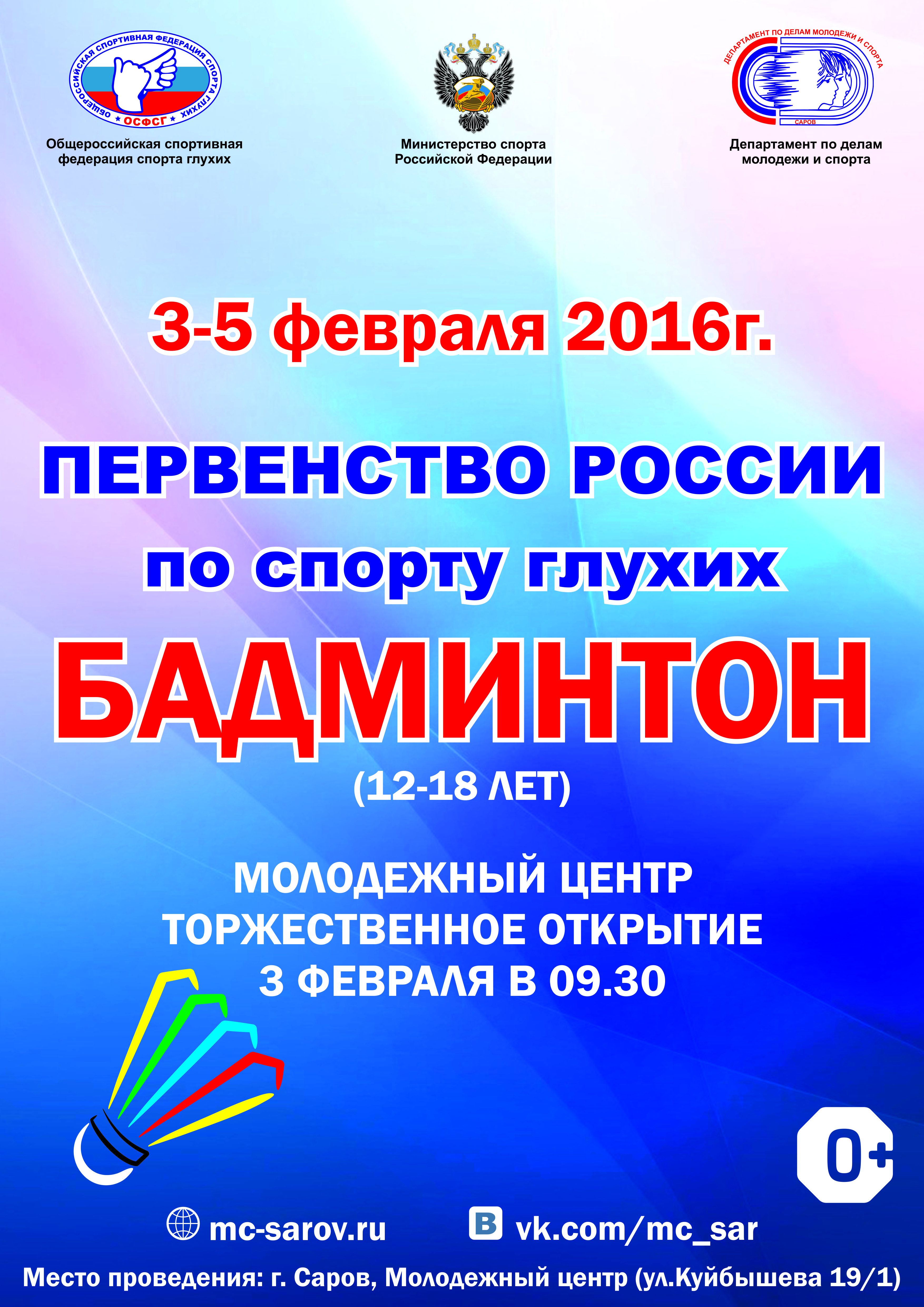 Департамент по делам молодежи и спорта сообщает, что с 3 по 5 февраля в Сарове пройдет первенство России по бадминтону (спорт глухих). В соревнованиях на базе Молодежного центра примут участие представители различных регионов страны в возрасте от 12 до 18 лет.