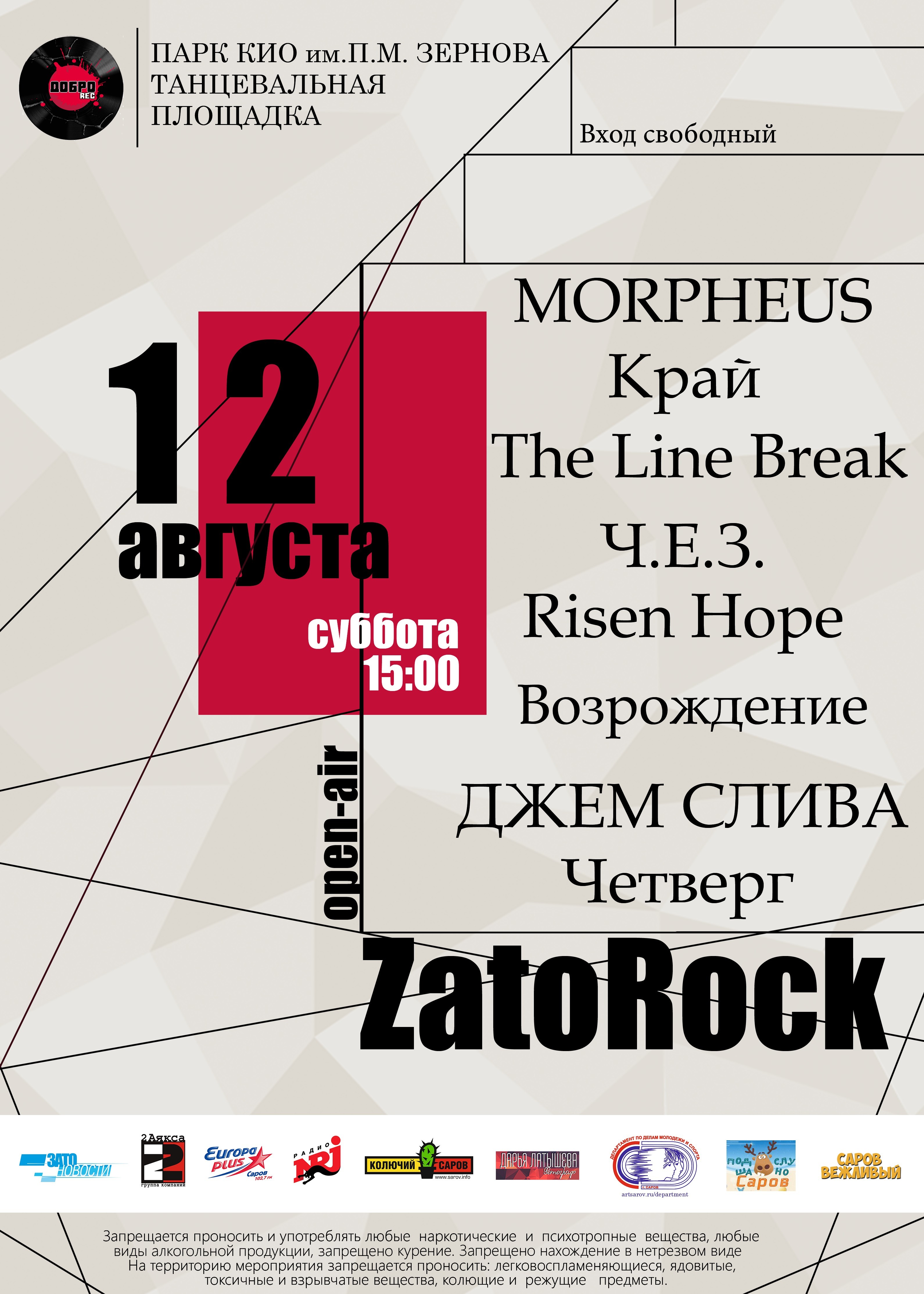В субботу, 12 августа на танцевальной площадке парка культуры и отдыха им. Зернова выступят рок-группы Risen Hope, Край, ЧЕЗ, Джем слива, The line break, Четверг и Морфеус. Начало в 15 часов.