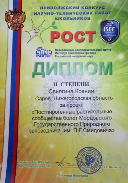 В финале участвовали Сергей Кульков (руководитель Эльвира Шарапова) и Ксения Свиягина (руководитель Марина Макеева), учащиеся кружков Станции юных натуралистов. Ксения Свиягина заняла второе место по итогам защиты на постерной сессии и награждена дипломом II степени за работу по теме: «Постпирогенные растительные сообщества болот Мордовского государственного природного заповедника им. П.Г. Смидовича».