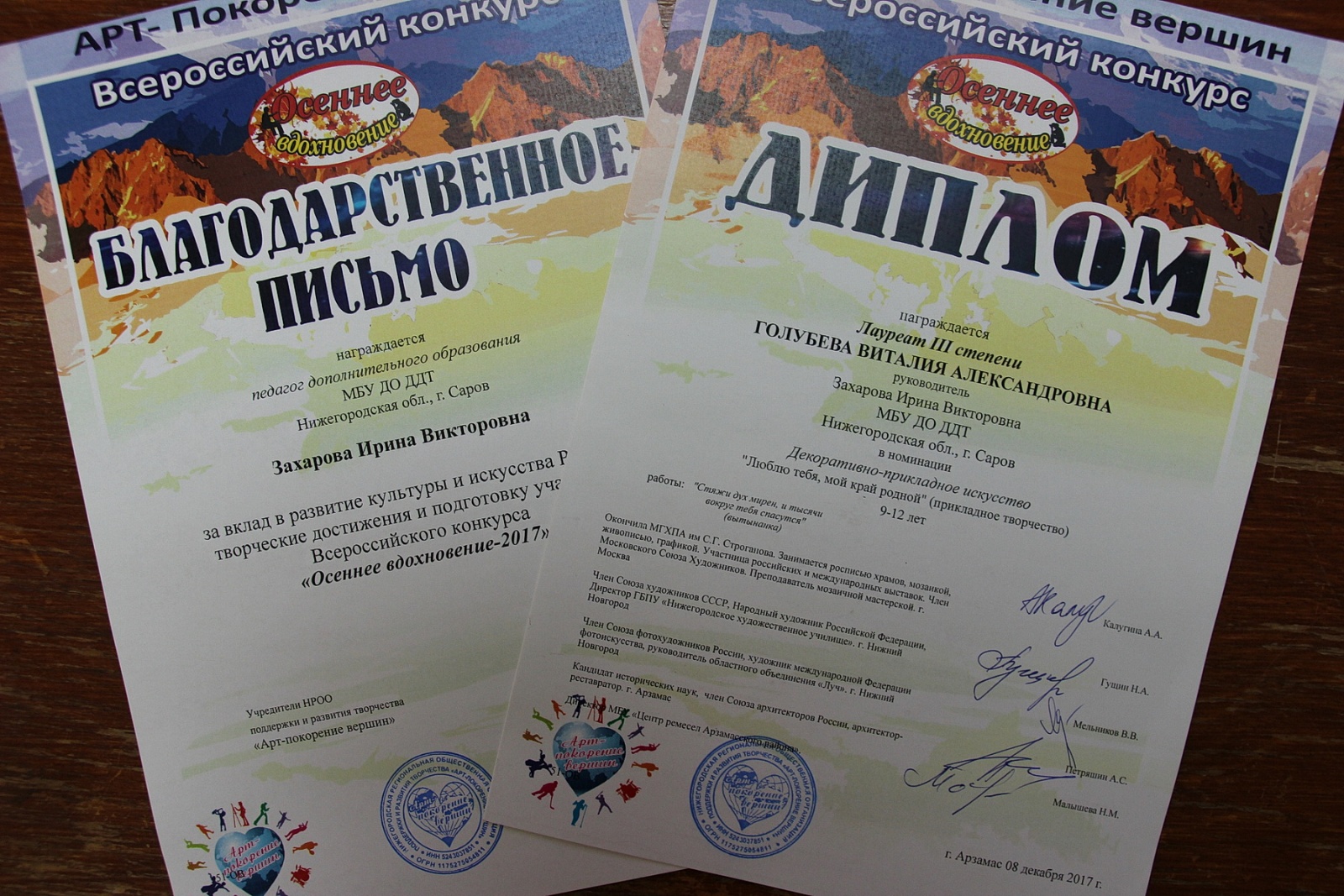 На Всероссийском конкурсе «Осеннее вдохновение», который прошел 8 декабря в Арзамасе, Виталия Голубева стала лауреатом III степени в номинации «Декоративно-прикладное искусство». Воспитанница объединения «Бумагопластика» представила вытынанку «Стяжи дух мирен, и тысячи вокруг тебя спасутся».