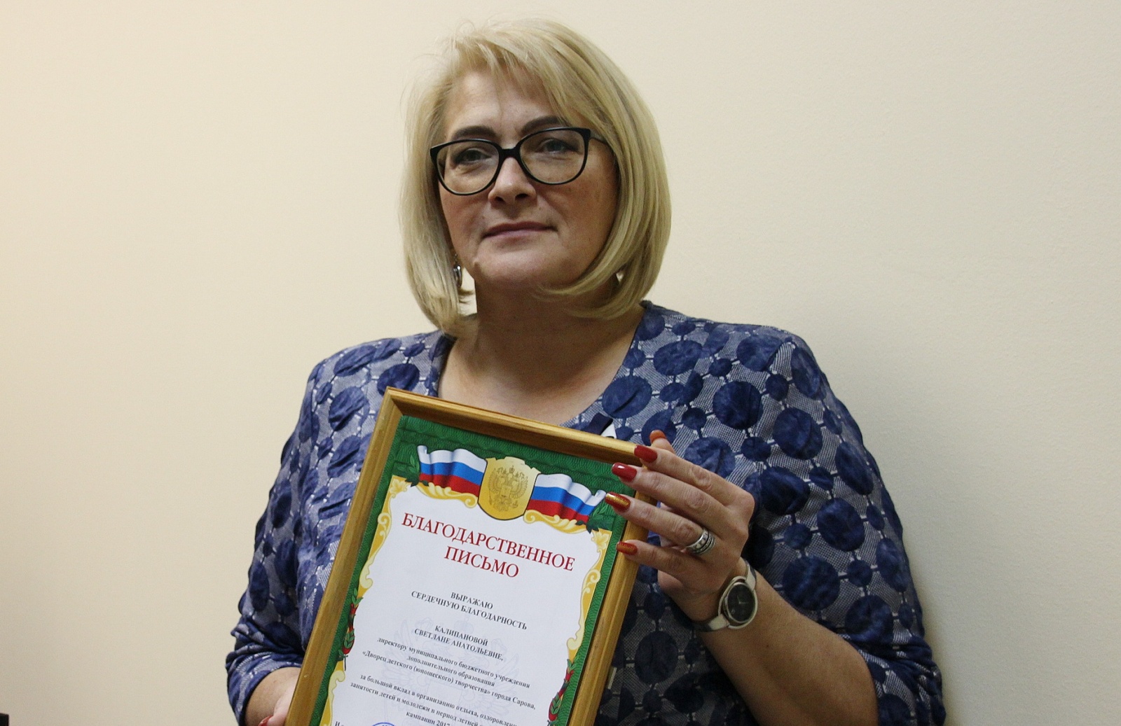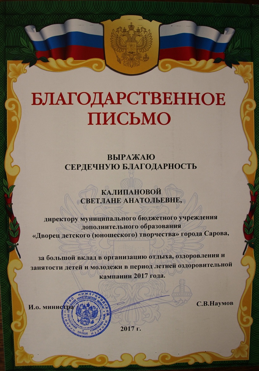 Итоги летней оздоровительной кампании 2017 года были подведены на заседании областного Координационного совета. За большой вклад в организацию отдыха, оздоровления и занятости детей и молодежи благодарственным письмом за подписью Сергея Наумова, исполняющего обязанности министра образования Нижегородской области, награждена директор Дворца детского (юношеского) творчества города Сарова Светлана Калипанова.