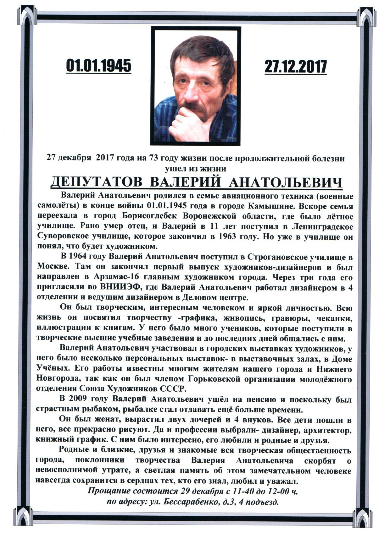Саровчан, приглашают проститься с Депутатовым Валерием Анатольевичем