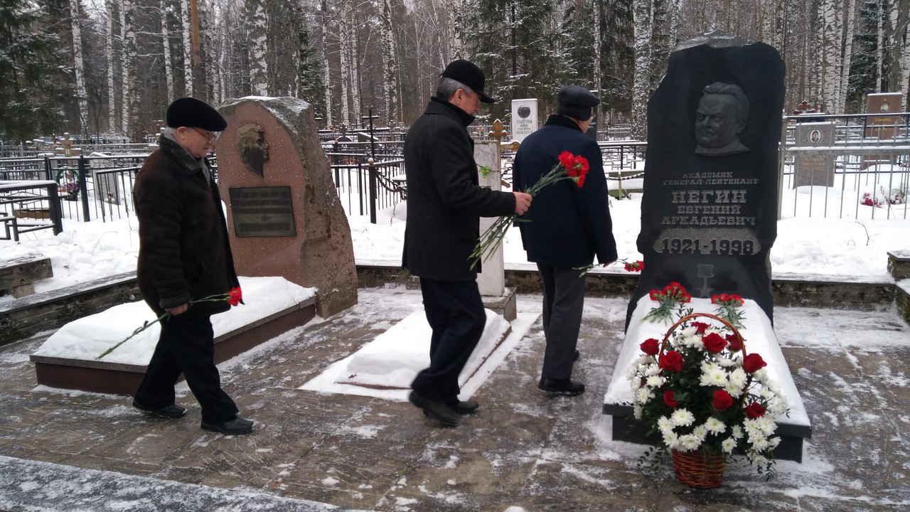 Руководители ядерного центра возложили цветы к памятной доске на здании управления ядерного центра, а затем отправилась на кладбище к могиле Евгения Аркадьевича.