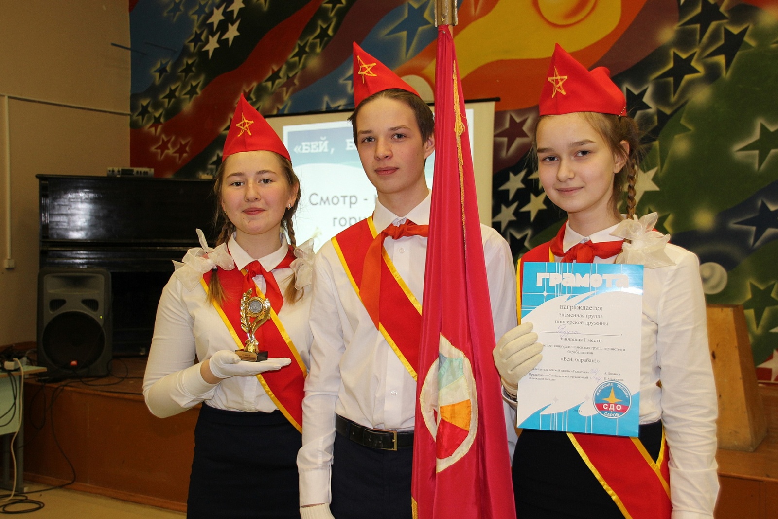 Первыми соревновались знаменные группы из 11 дружин. Все были примерно равны в исполнении команд, поэтому жюри попросило три знаменные группы пройти еще раз, чтобы выявить сильнейших. В итоге третье место заняла детская организация «ЮВеНТа» из школы № 16, второе место — у пионерской организации «Космическая» имени Г. С. Титова из лицея № 3. А победе радовалась делегация пионерской дружины «Радуга» из гимназии № 2. Их знаменосец Арсений Володько и ассистенты Анастасия Виноградская с Викторией Казаковой дважды выполнили все действия четко и уверенно.