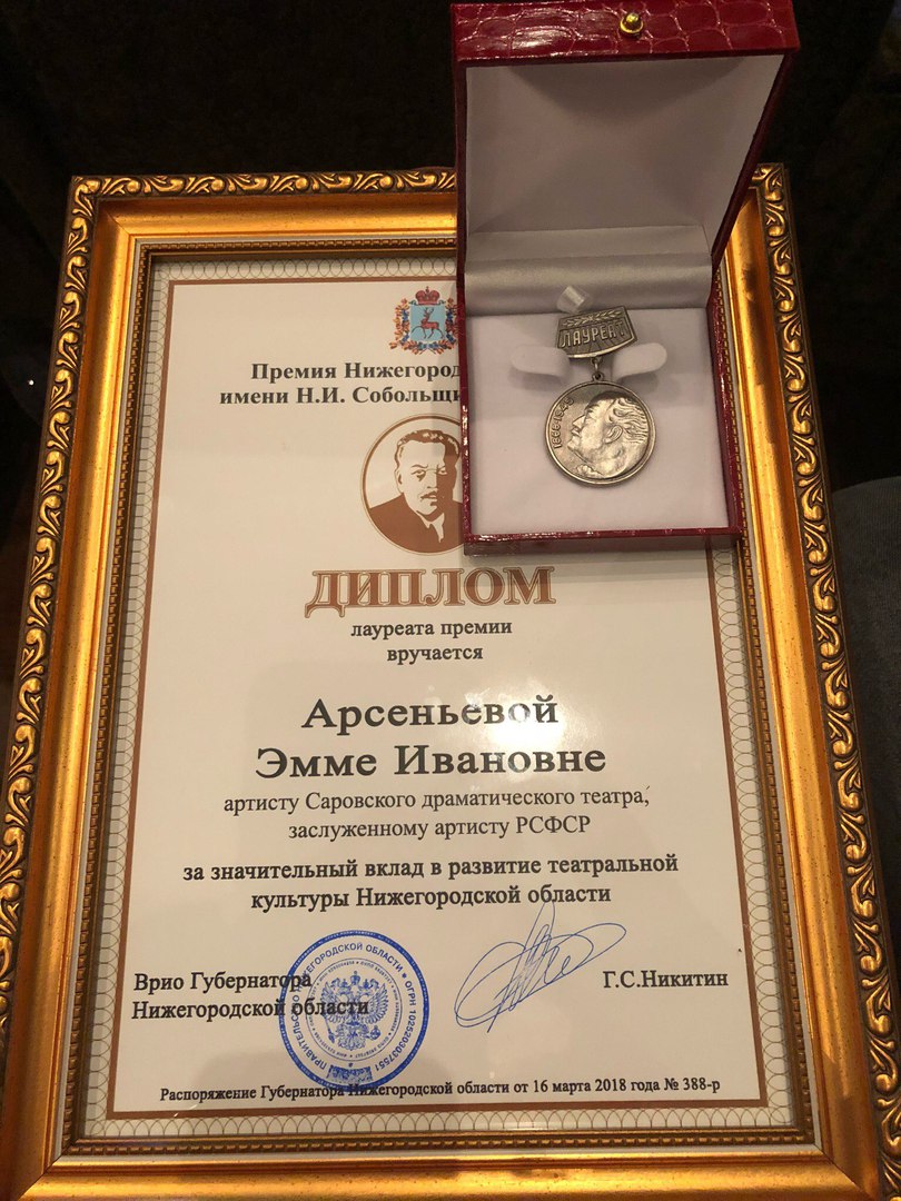 Решением главы региона Глеба Никитина заслуженная артистка России, служащая в саровском драматического театре, Эмма Арсеньева награждена Премией имени Н.И. Собольщикова-Самарина. Эта награда является самым почетным из возможных поощрений, вручаемых в театральной среде Нижегородской области и традиционно присуждается ко Дню театра, который отмечается 27 марта.