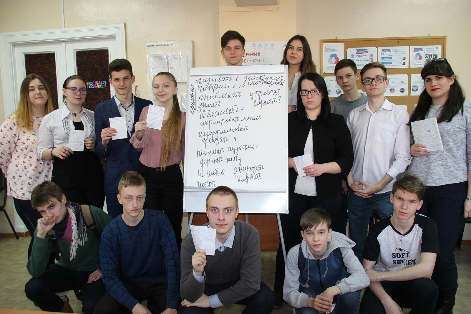 16 представителей молодежных организаций лицея № 3, школ №№ 5, 7, 10, 11, 13, 14, 16, 20 вместе с методистом ДДТ Светланой Михайловой-Листрем разобрали типовые ошибки начинающих ораторов, сформулировали требования аудитории (чего люди ждут от выступающего и к чему они не готовы ни при каких обстоятельствах), проиграли несколько возможных ситуаций и обсудили приемы, помогающие достигать целей.