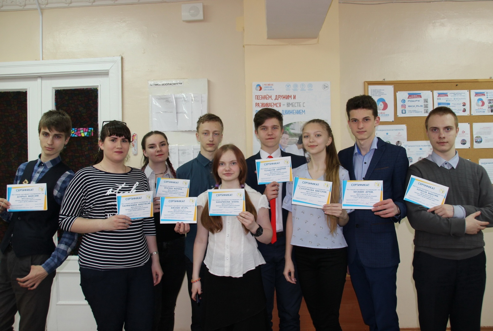 Документ за подписью координатора городского Союза старшеклассников «СтаТУС» Екатерины Маркеловой и президента координационного совета ГСС «СтаТУС» Виктории Сухоруковой в торжественной обстановке получили: Алена Бакаринова и Марина Брагина (лицей № 3), Игорь Афонин и Дмитрий Толмачев (школа № 5), Максим Добрых (школа № 7), Артем Белавин (школа № 10), Анастасия Панфилкина (школа № 13), Виктория Сухорукова (школа № 14), Матвей Курилов (школа № 16).
