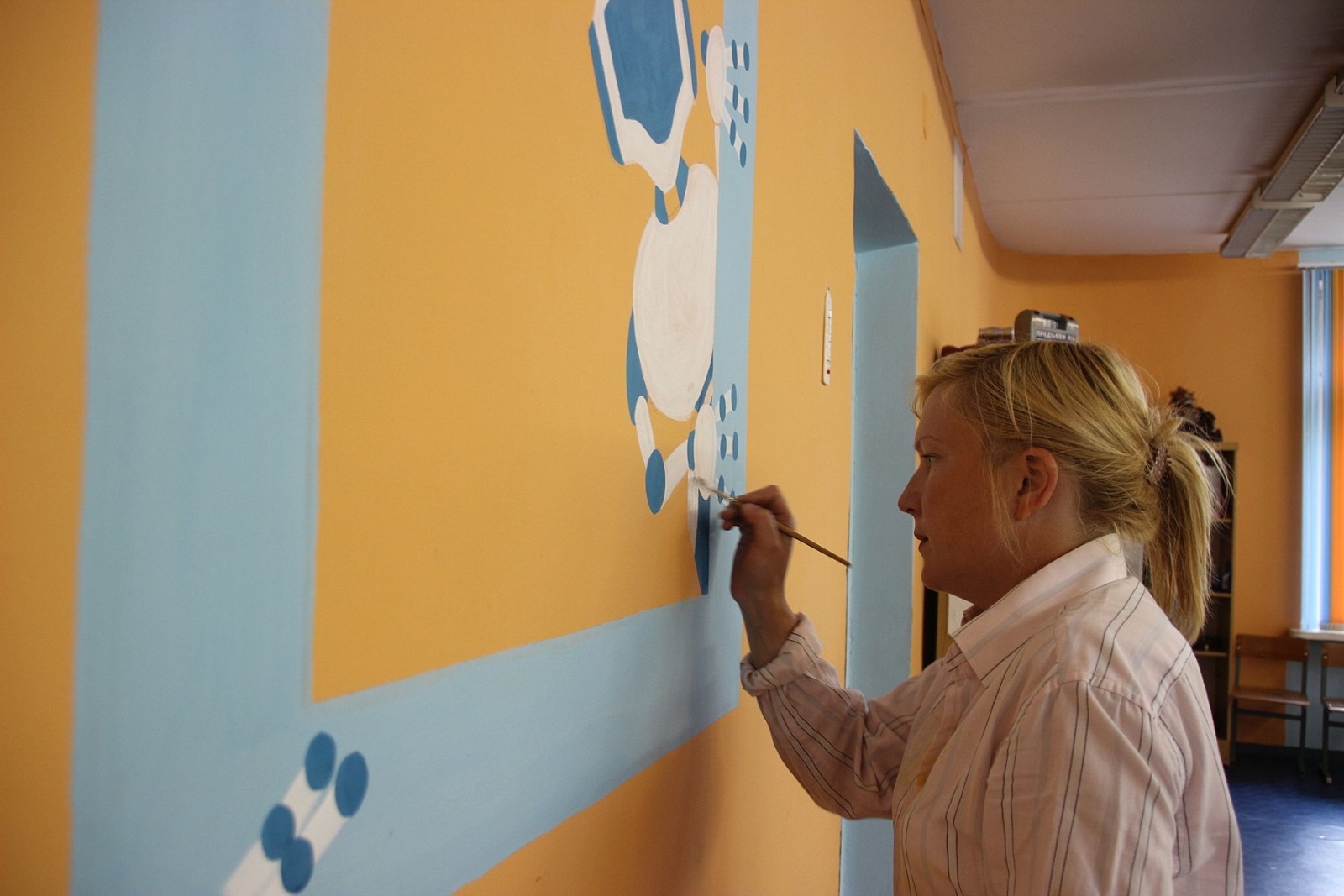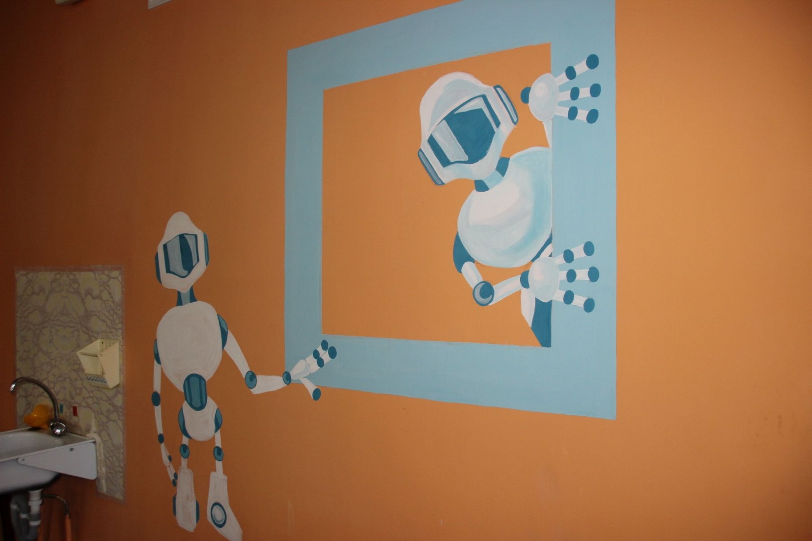 Педагоги Дворца детского творчества, которые используют в образовательном процессе разнообразные ресурсы, решили заметно изменить интерьеры своих кабинетов. Ирина Захарова, руководитель объединений «Начальное техническое моделирование», «Бумагопластика» и «3D моделирование», в перерывах между занятиями с детьми из летнего лагеря «Искорка» разрисовала стены, добавив колорита и настроения.