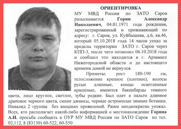 Разыскивается саровчанин, нуждающийся в медицинской помощи