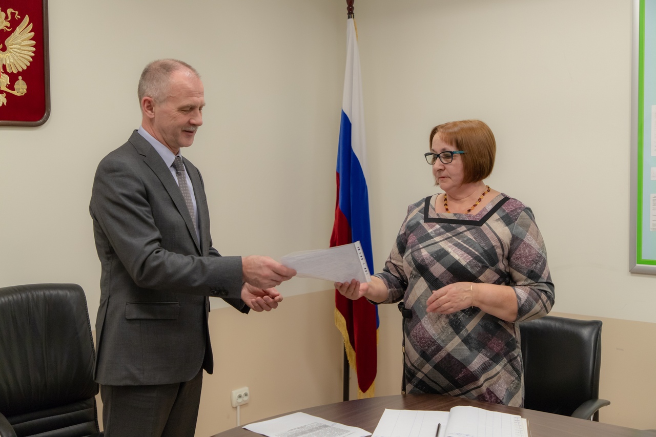 Глава администрации Сарова Алексей Голубев вручил ветерану Ядерного центра Тамаре Гусевой сертификат на 1,4 миллиона рублей в рамках программы поддержки выезжающих из ЗАТО на постоянное место жительства.