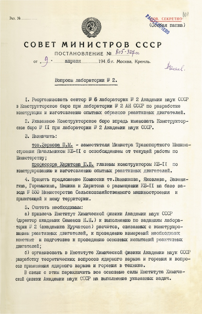 9 апреля 1946 года было подписано Постановление Совета Министров СССР с грифом «Совершенно секретно» об образовании в поселке Саров Мордовской АССР закрытого конструкторского бюро № 11 для работы над советским атомным проектом.