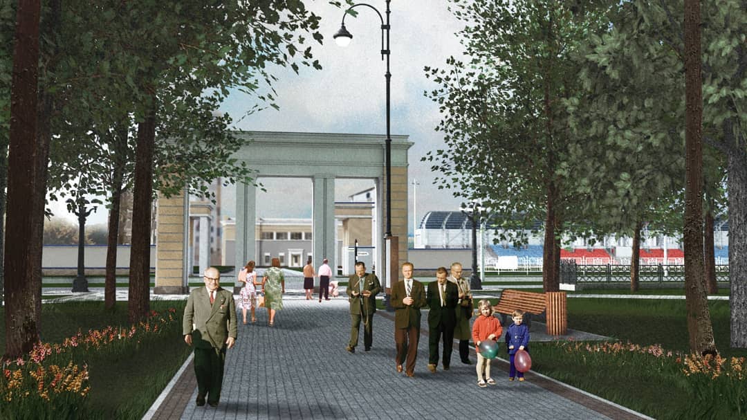 На аллеях появятся чугунные лавки дизайна 30-х годов, фонари классических форм. Вход со стороны проспекта Музрукова приобретет исторический вид и создаст единый ансамбль с входной группой на территорию стадиона «Икар».