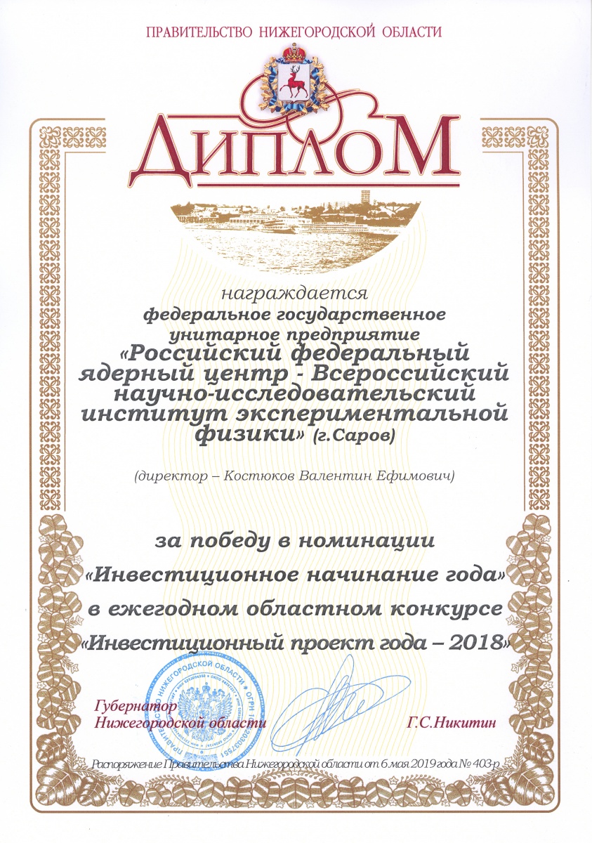 РФЯЦ-ВНИИЭФ одержал победу в конкурсе «Инвестиционный проект года — 2018»