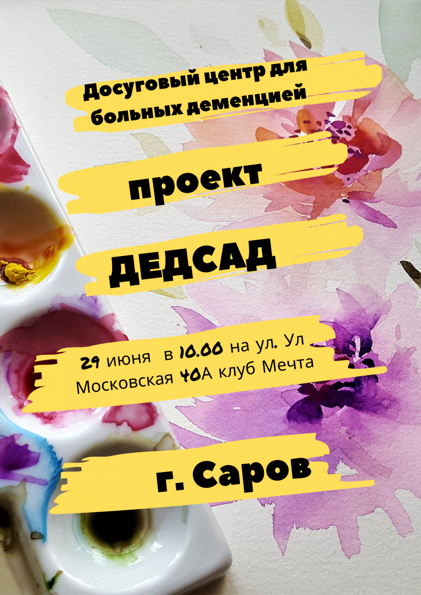 29.06.2019г. в 10.00 «ДЕДсад» Досуг для пожилых людей с деменцией. Мероприятие пройдет по адресу г. Саров, улица Московская 40а, клуб Мечта.
