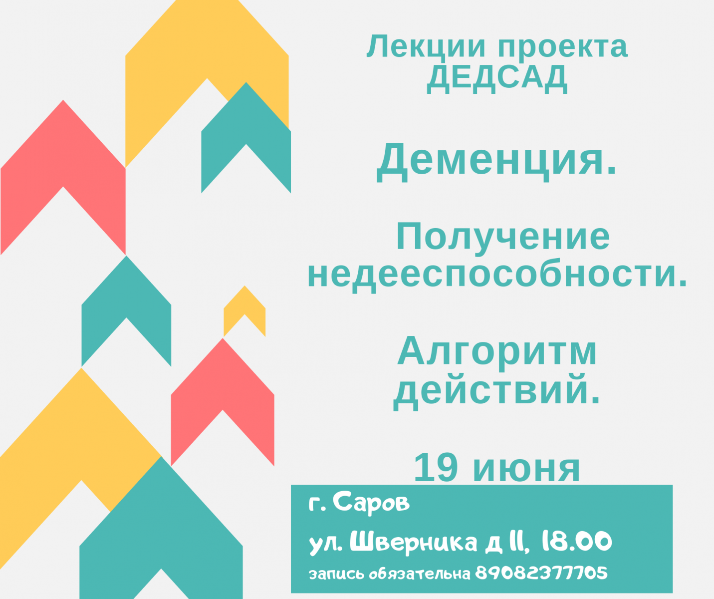 19.06.2019г. Лекция. «Деменция. Оформление недееспособности» по адресу г. Саров, улица Шверника 16, начало в 18.00. Читает ведущий специалист управления социальной защиты Рыжих О.С. Запись обязательна! телефон 8 908−23−777−05