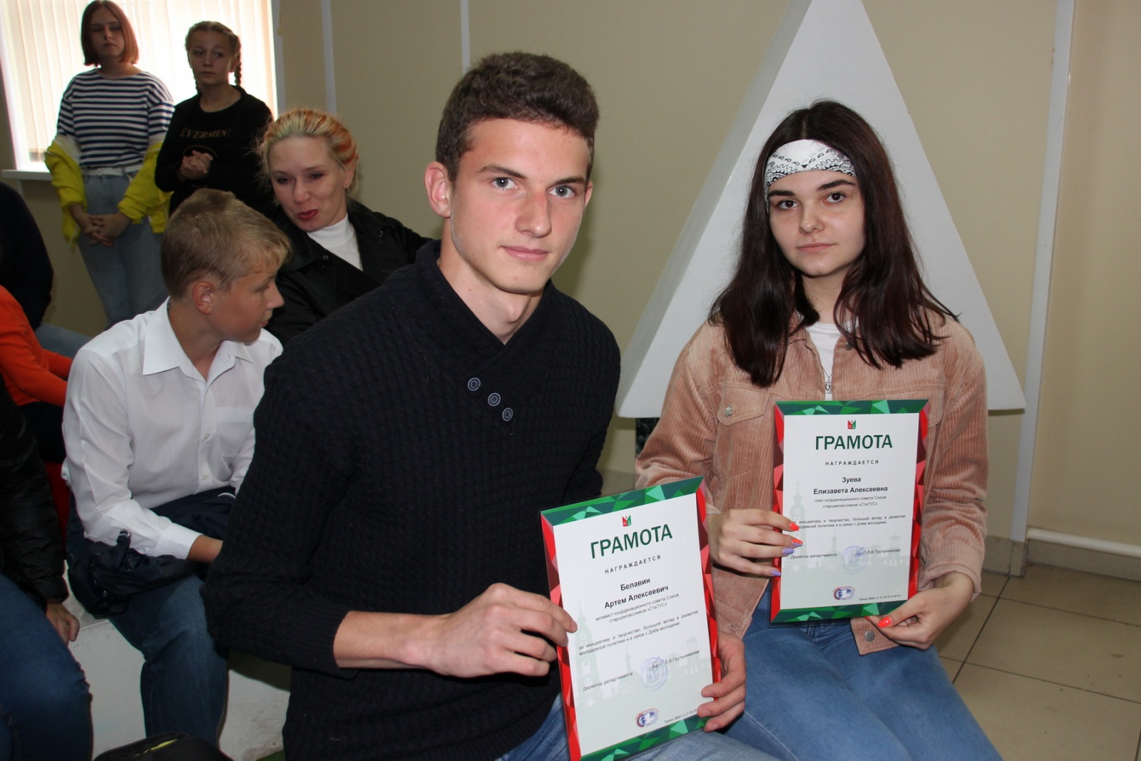За инициативу и творчество грамотами департамента по делам молодежи и спорта награждены активисты координационного совета союза «СтаТУС» Артем Белавин и Елизавета Зуева, а также председатель детской палаты «Галактика» СДО «Сияющие звезды» Анастасия Виноградская.