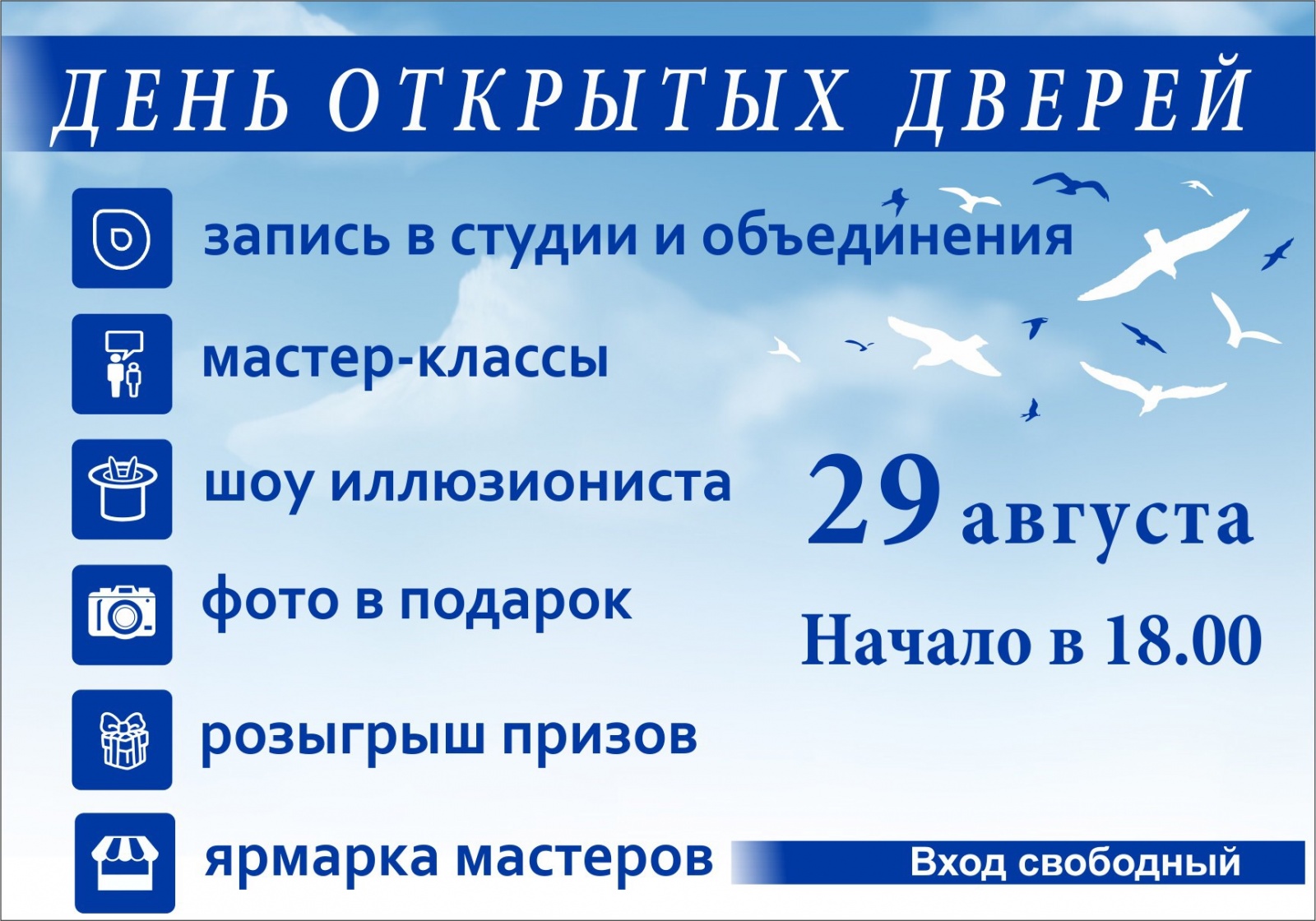29 августа в 18:00 Молодежный центр приглашает саровчан на День открытых дверей. Гостей ждет интересная программа: презентация направлений работы центра, знакомство с педагогами, запись в студии и объединения, мастер-классы.