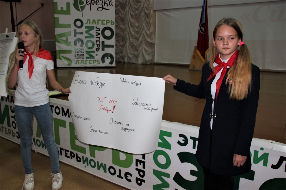 Суббота началась с зарядки, которую подготовили и провели «галактиане», а после завтрака (кстати, кормили в «Березке», как обычно, вкусно) настал период для умственной работы. Делегаты тщательно проработали содержание занятий в Школе пионерских профессий на 2019−2020 учебный год и представили коллективно-творческие дела, но больше всего времени посвятили актуализации проекта, посвященного 75-летию Победы в Великой Отечественной войне.