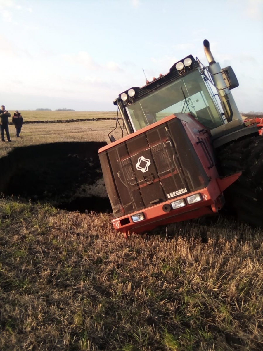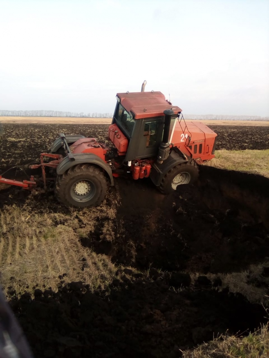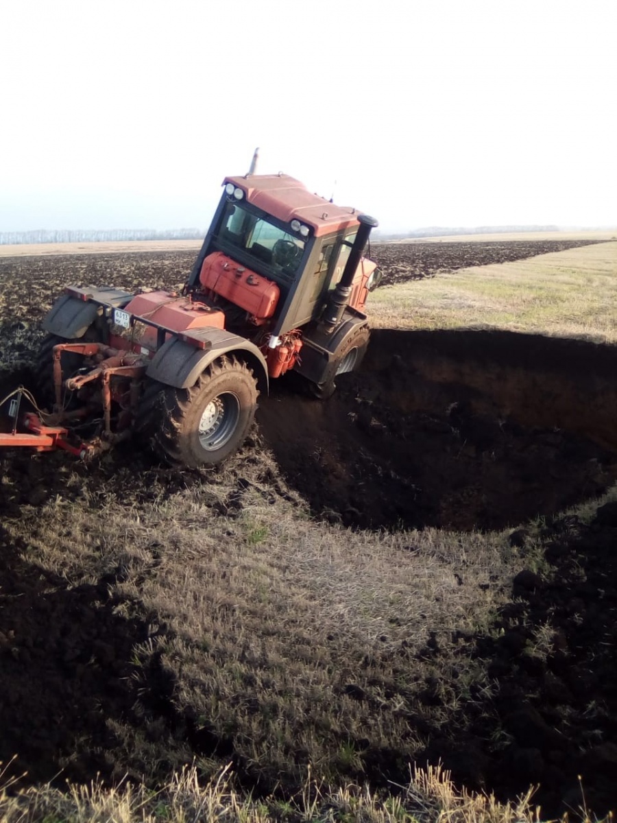 Трактор не попал в воронку только, потому что зацепился дискатором. Образовавшийся кратер засосал бы в свои недра и технику, и тракториста, если бы ни прицепной инвентарь, который не позволил трактору сползти в образовавшийся провал.