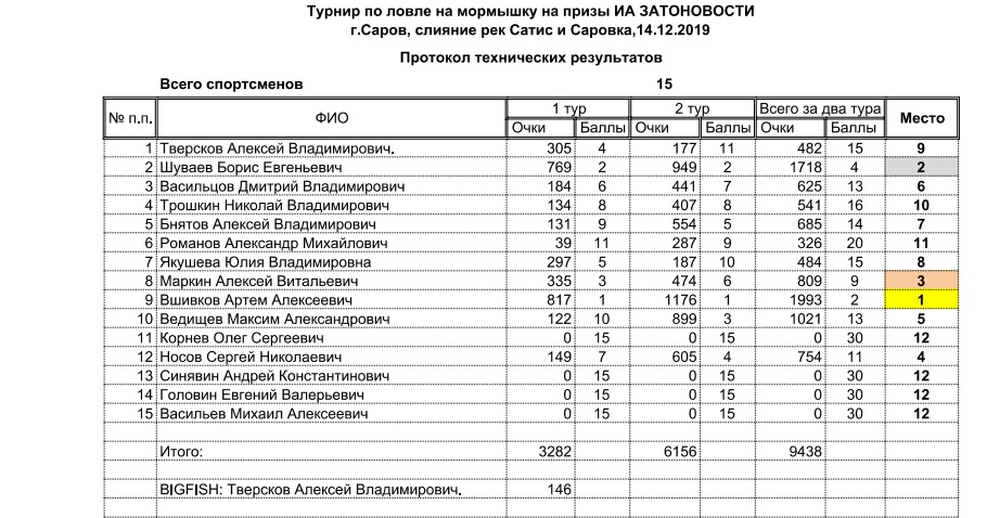 В соревнованиях приняли участие 15 спортсменов. Слияние рек Сатис и Саровка место рыбное и в уловах присутствовали плотва, подлещик, окунь, ёрш и уклея. Ловля проходила в два тура, в ходе которых определились сильнейшие рыболовы-спортсмены города.