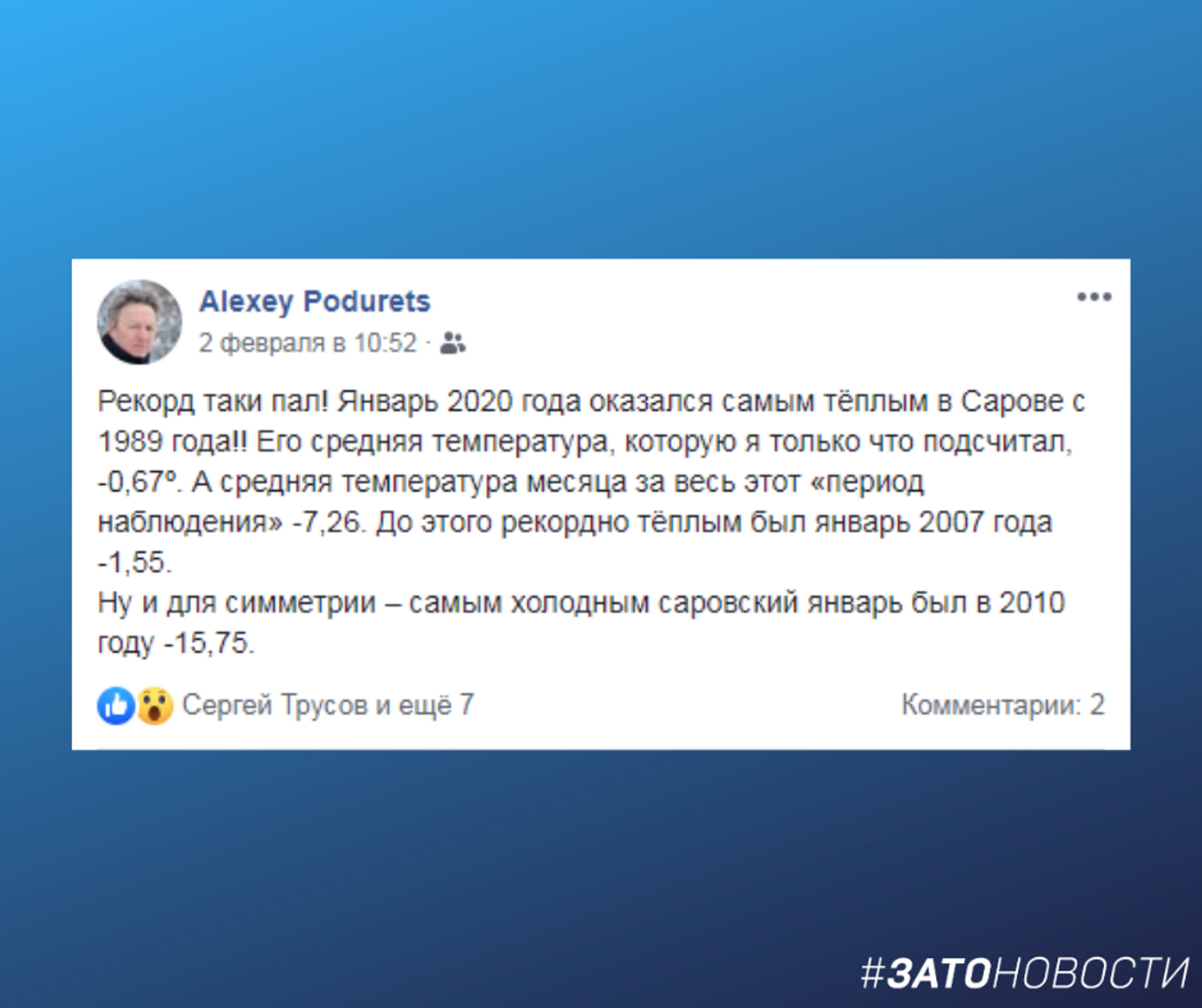 Саровский краевед Алексей Подурец сообщает, что температурный рекорд Сарова в январе побит