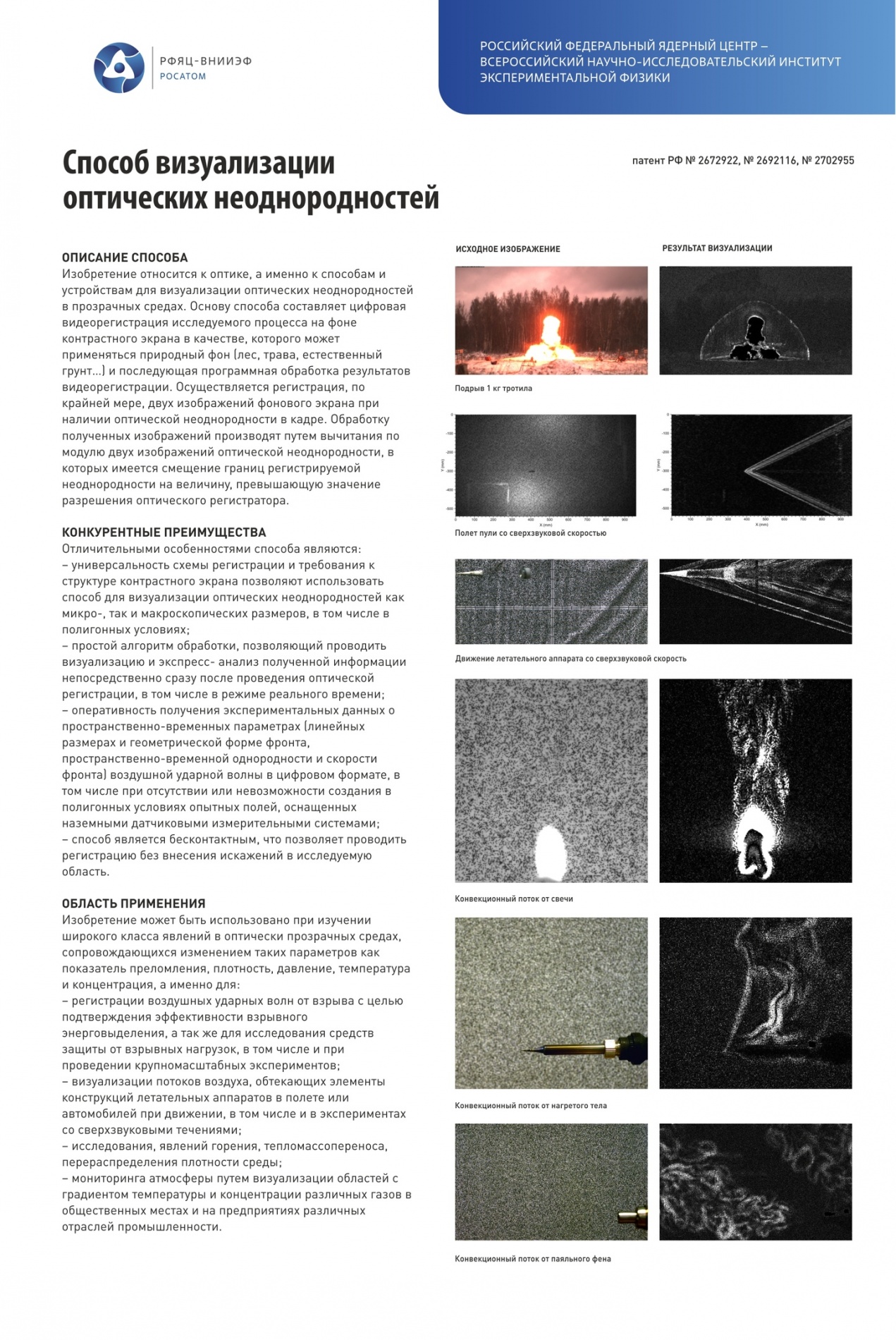 Основу способа визуализации оптических неоднородностей составляет цифровая видеорегистрация исследуемого процесса на природном фоне и последующая программная обработка результатов. Изобретение может быть использовано при изучении различных явлений в оптически прозрачных средах, включая визуализацию потоков воздуха, обтекающих элементы конструкций летательных аппаратов в полете и автомобилей при движении; мониторинга температуры и концентрации газов в атмосфере в общественных местах и на промышленных предприятиях и др.