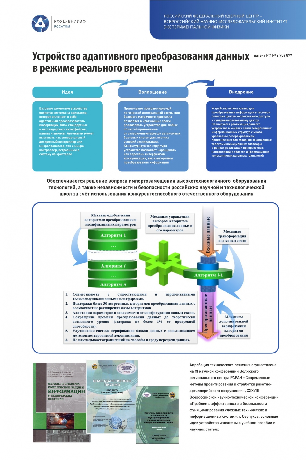Золотой медали Салона удостоено Устройство адаптивного преобразования данных в режиме реального времени. Разработка применима в создании защищенных телекоммуникационных платформ и решает проблему импортозамещения всокотехнологичного оборудования и технологий, а также независимости и безопасности российской научной и технологических школ.