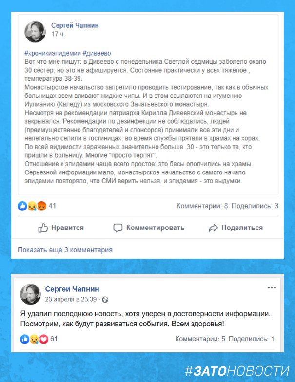 В публикации говорится, что информация о болезни сестер не афишируется, но якобы почти у всех тяжелое состояние, температура 38−39 °C. По словам Сергея Чапнина, якобы монастырское начальство могло запретить тестирование, мотивировав это тем, что в «обычных больницах всем вливают жидкие чипы». В публикации также говорится, что несмотря на рекомендации патриарха Кирилла Дивеевский монастырь якобы мог не закрыться, рекомендации по дезинфекции — не соблюдались, а прихожан и паломников якобы принимали все эти дни.