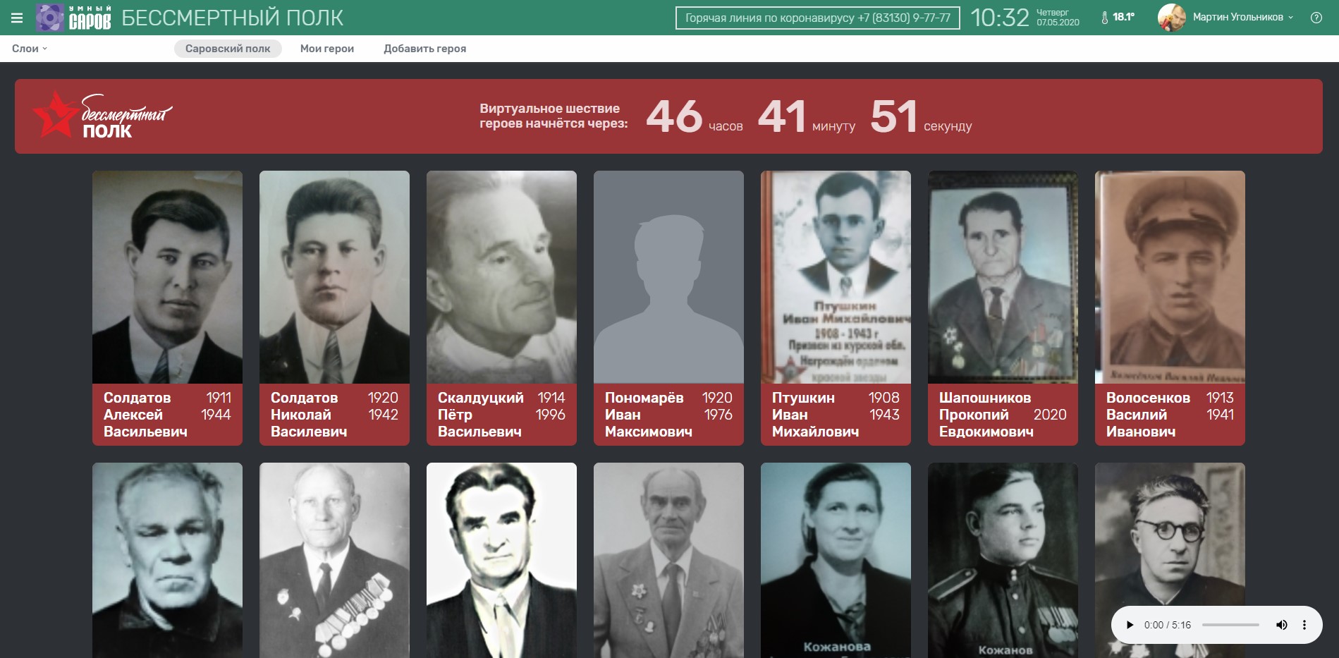 Уже почти 500 саровчан добавили информацию о своих предках — героях Великой Отечественной Войны на сайт «Умный Саров» в рамках онлайн-акции «Бессмертный полк». Напомню, что в этом году, в связи с пандемией традиционное шествие отменено, поэтому на сайте был запущен дополнительный слой, на котором вы можете добавить имя, фотографию и историю своего предка, воевавшего на фронтах или ковавшего победу в тылу.