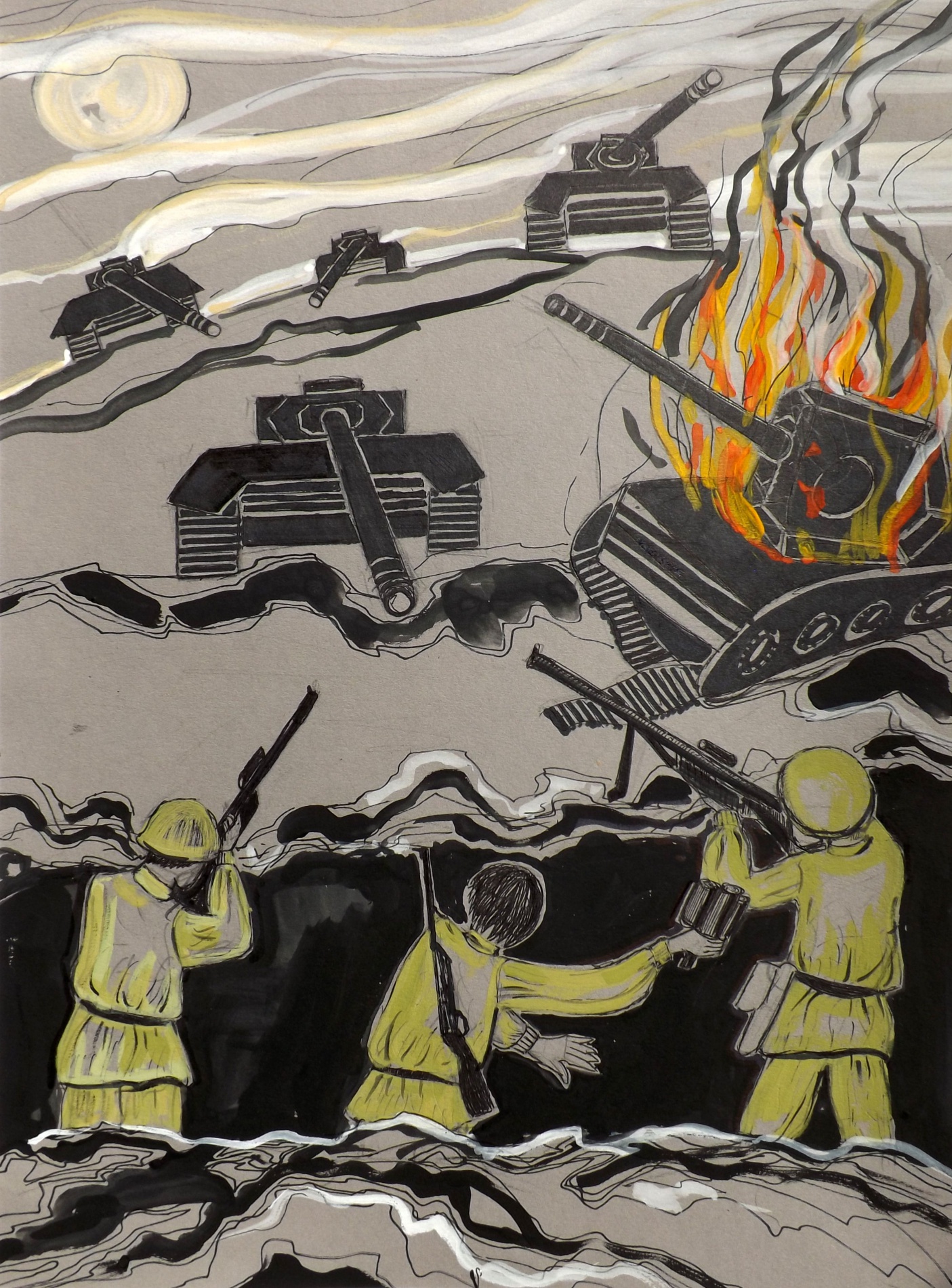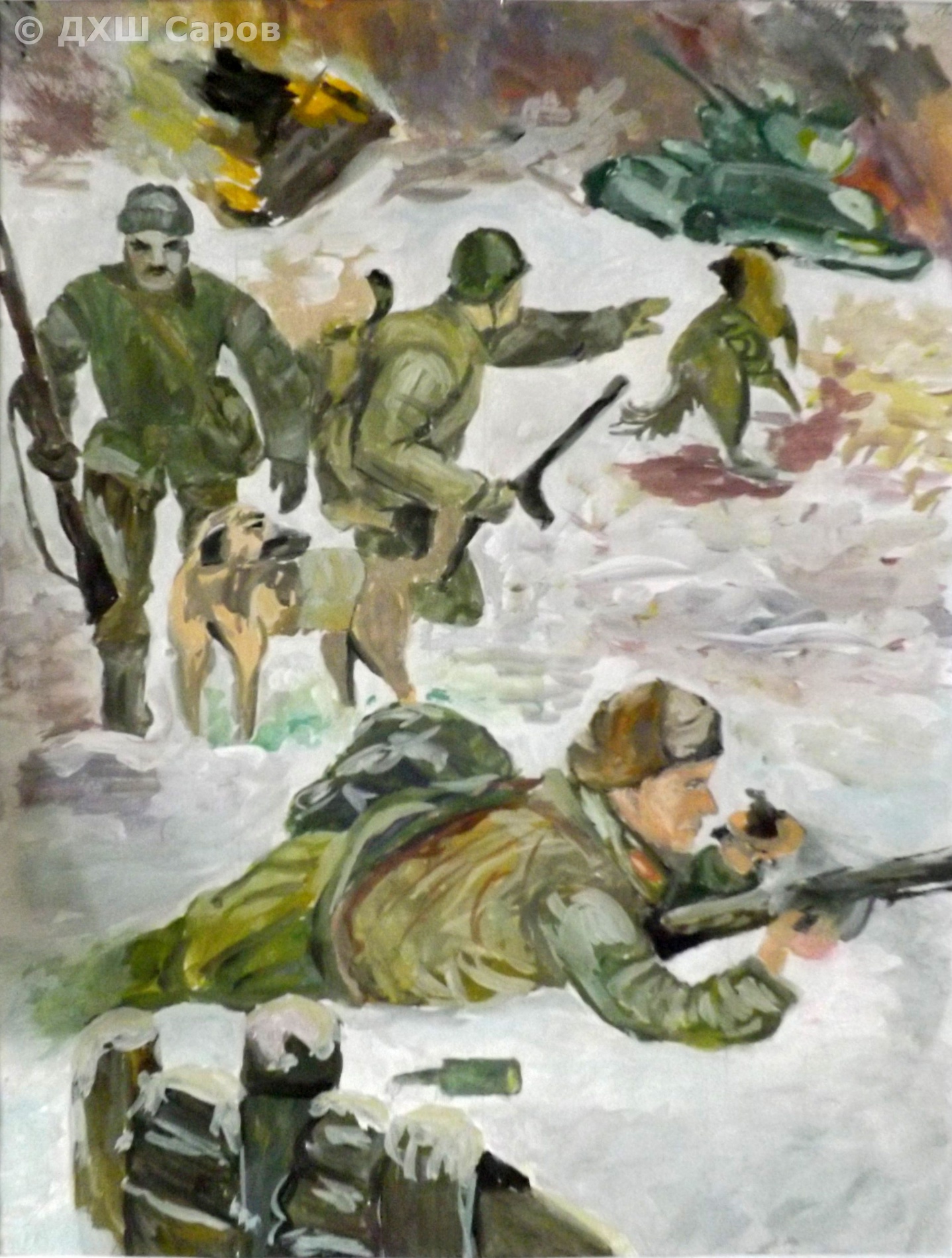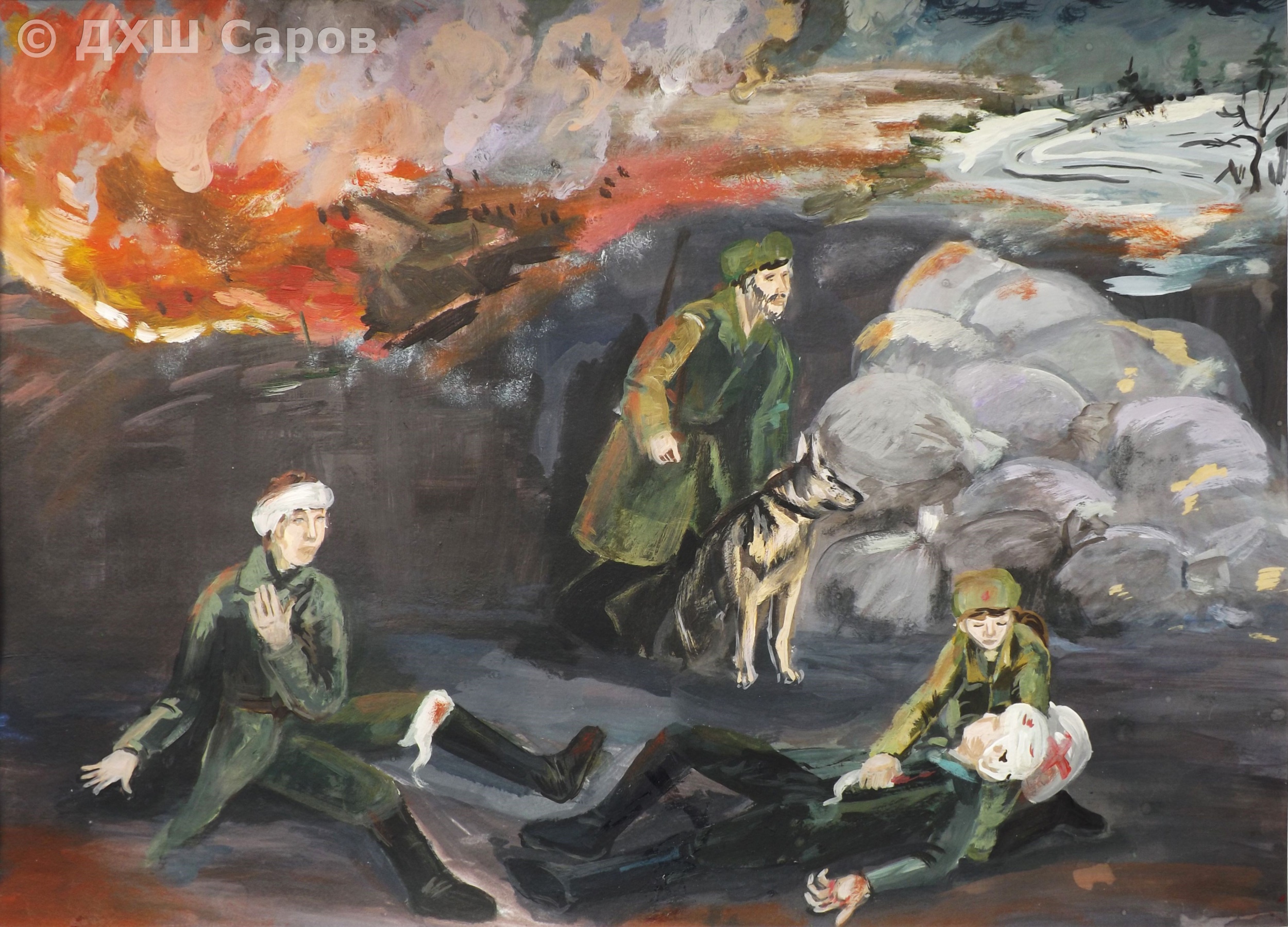 Экспозиция представленных работ повествует о трагических событиях освободительной войны советского народа с фашистскими захватчиками, о подвигах фронта и тыла, Героях, чьи мужественные сердца и поступки служат примером нам, послевоенным поколениям.