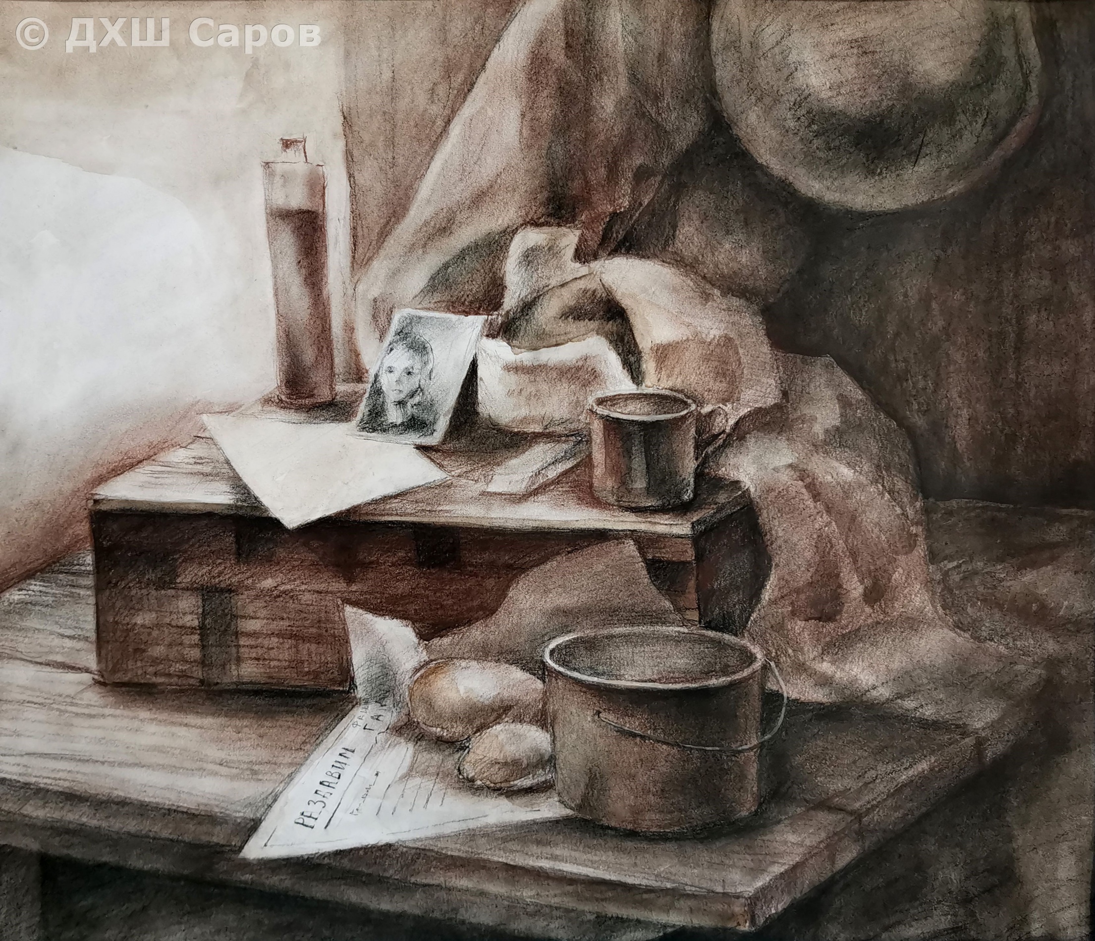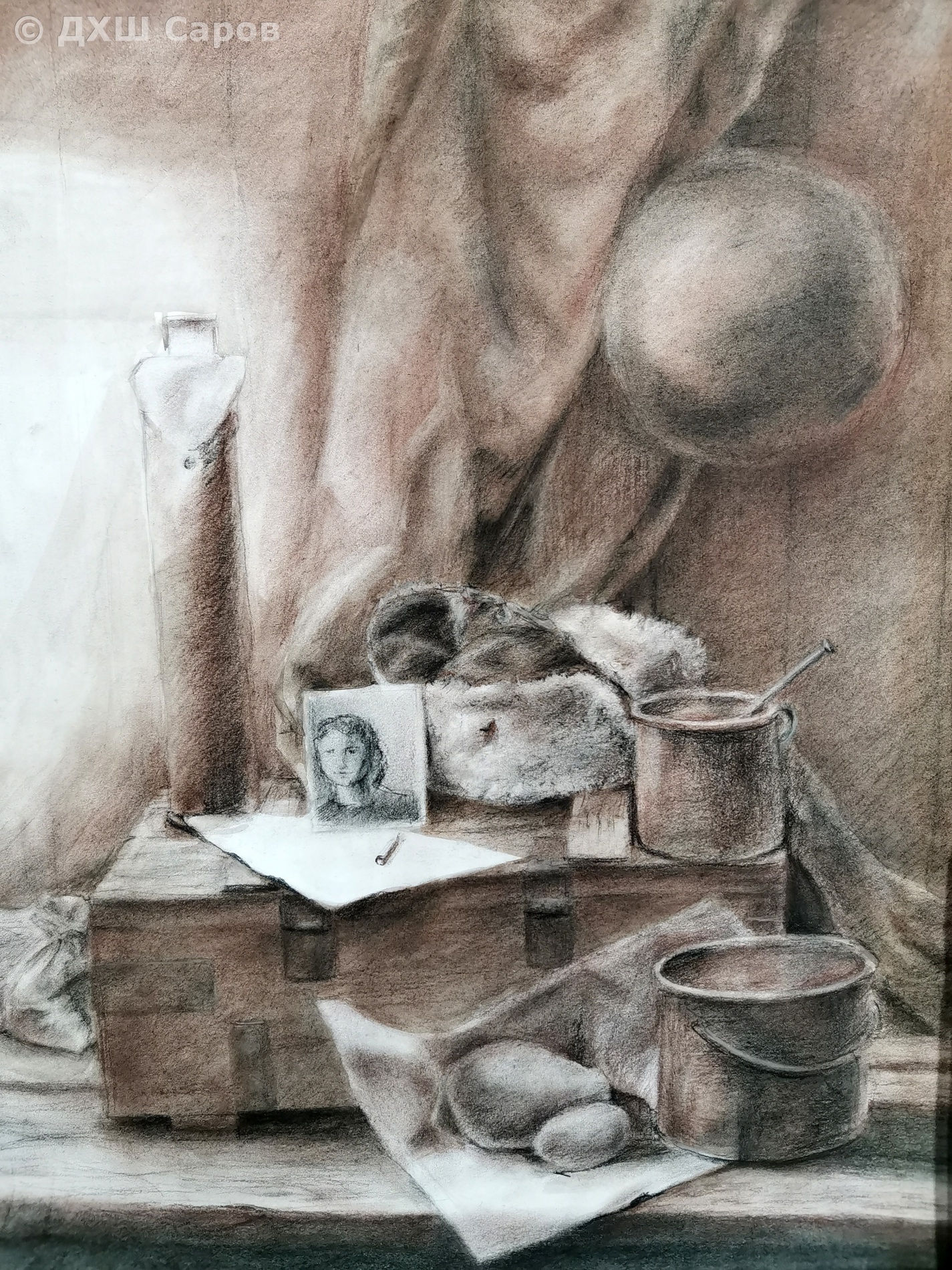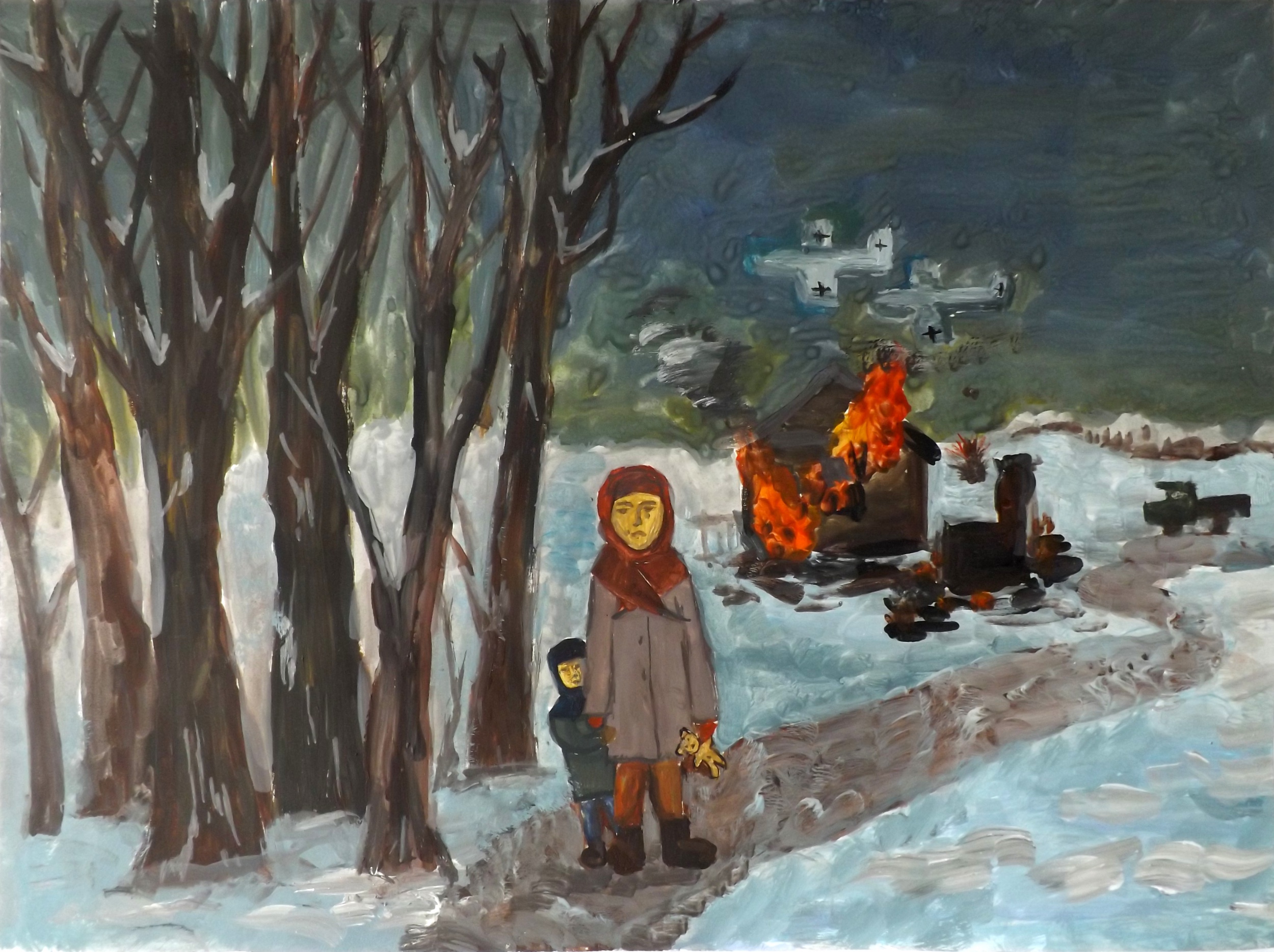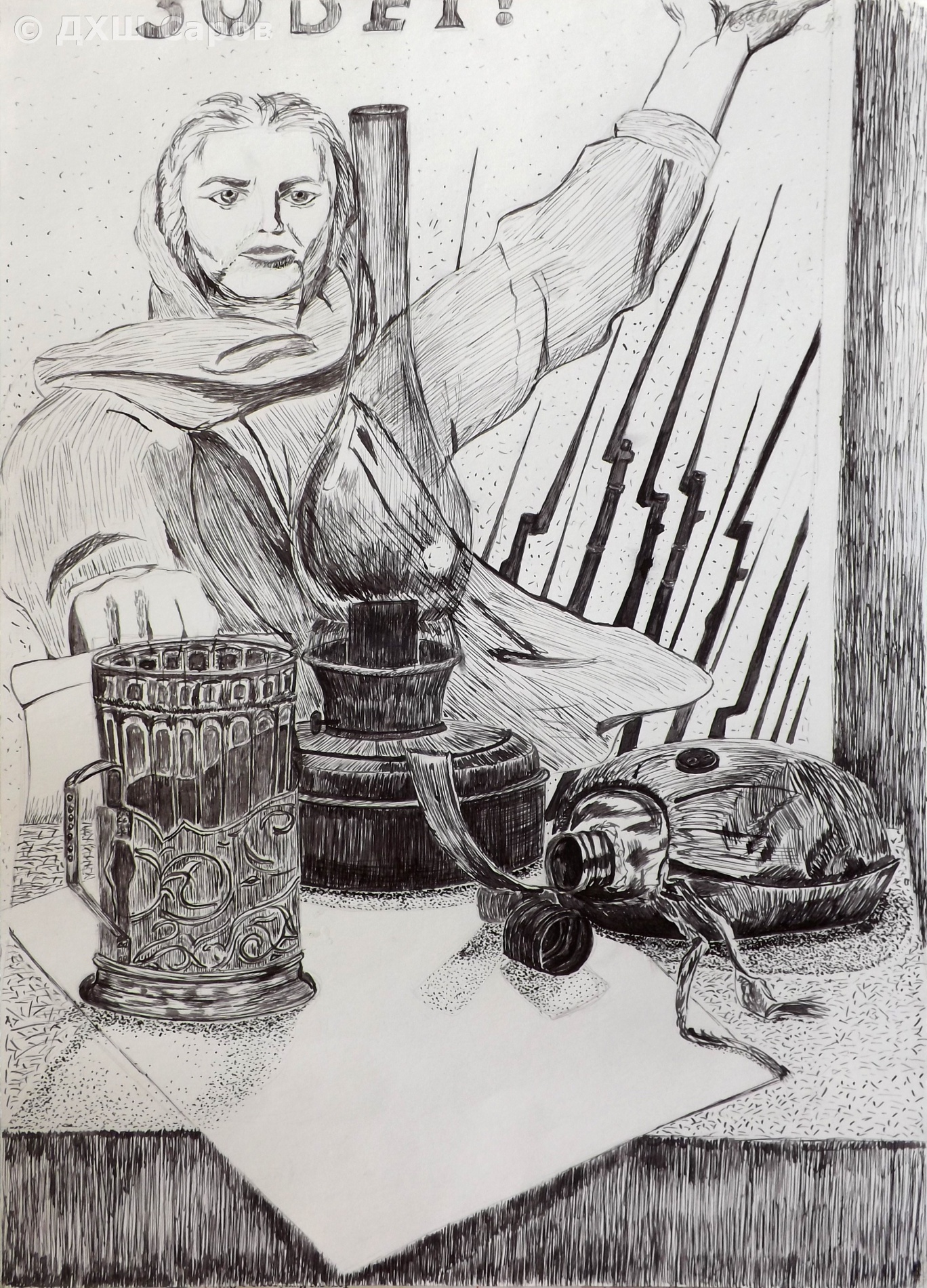 Экспозиция представленных работ повествует о трагических событиях освободительной войны советского народа с фашистскими захватчиками, о подвигах фронта и тыла, Героях, чьи мужественные сердца и поступки служат примером нам, послевоенным поколениям.