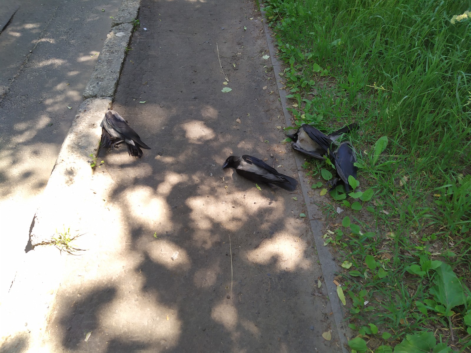 На фото — мёртвые вороны на улице Победы. Их расстреляли из пневматики.
