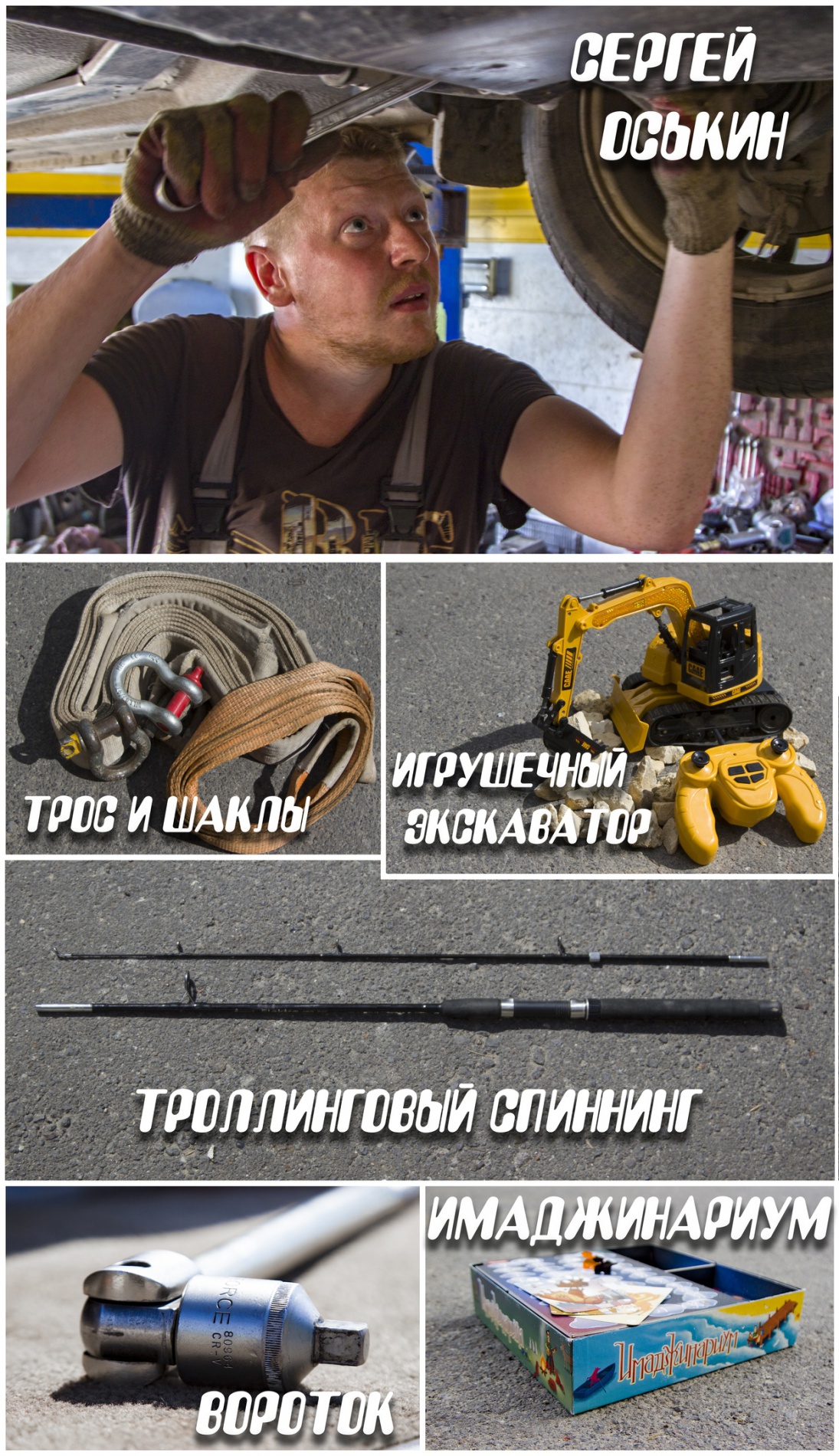 Состоит из: воротка, тросов и шаклов, троллингового спиннинга, игрушечного экскаватора и настольной игры «Имаджинариум».