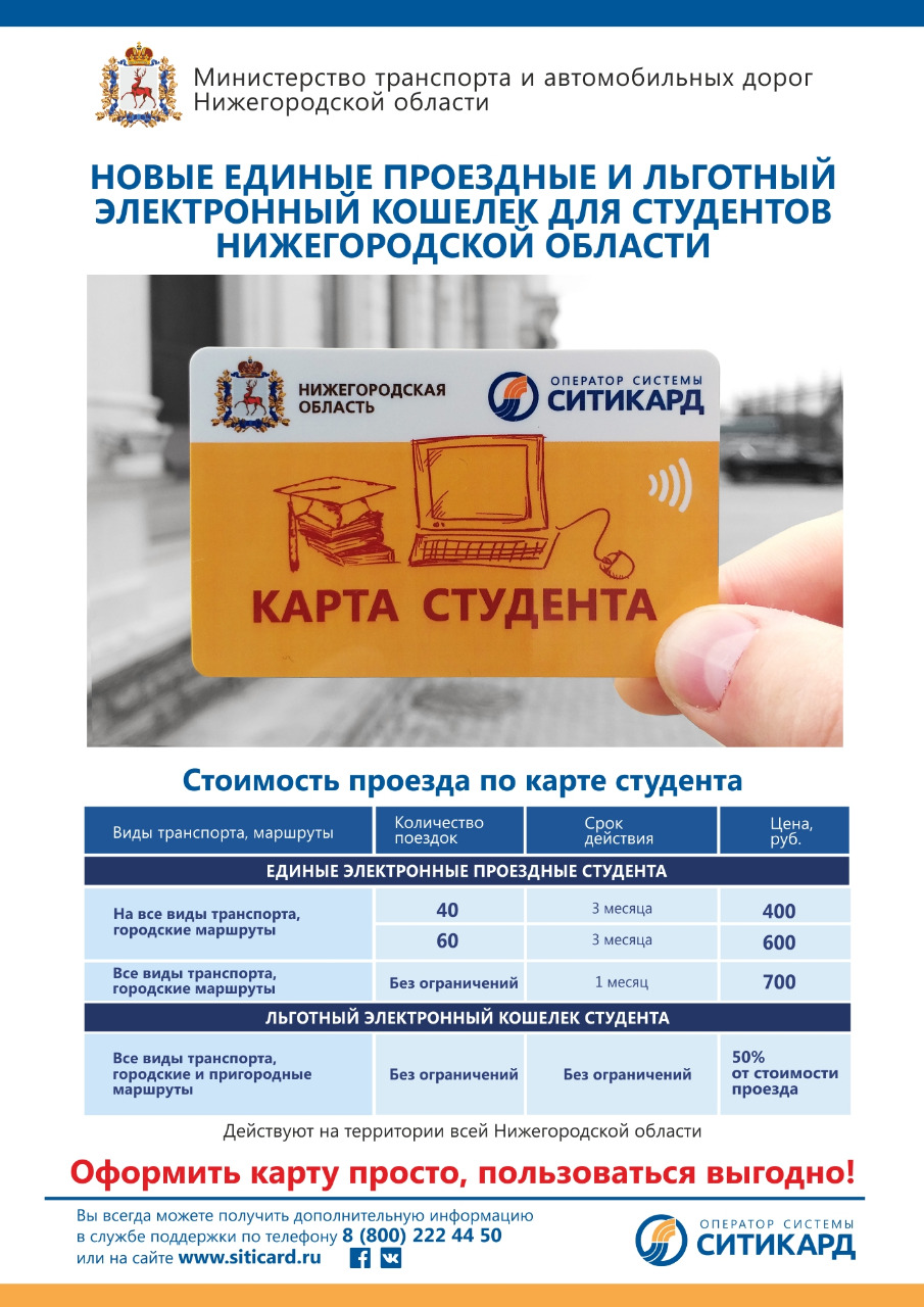Департамент городского хозяйства сообщает, что с 1 сентября вводятся новые проездные билеты для студентов. Их стоимость на 40 поездок в месяц составит 400 рублей, на 60 поездок — 600 рублей, на неограниченное число поездок в месяц — 700 рублей. Проездной действителен для всех видов внутригородского сообщения (автобусы, метро, трамваи