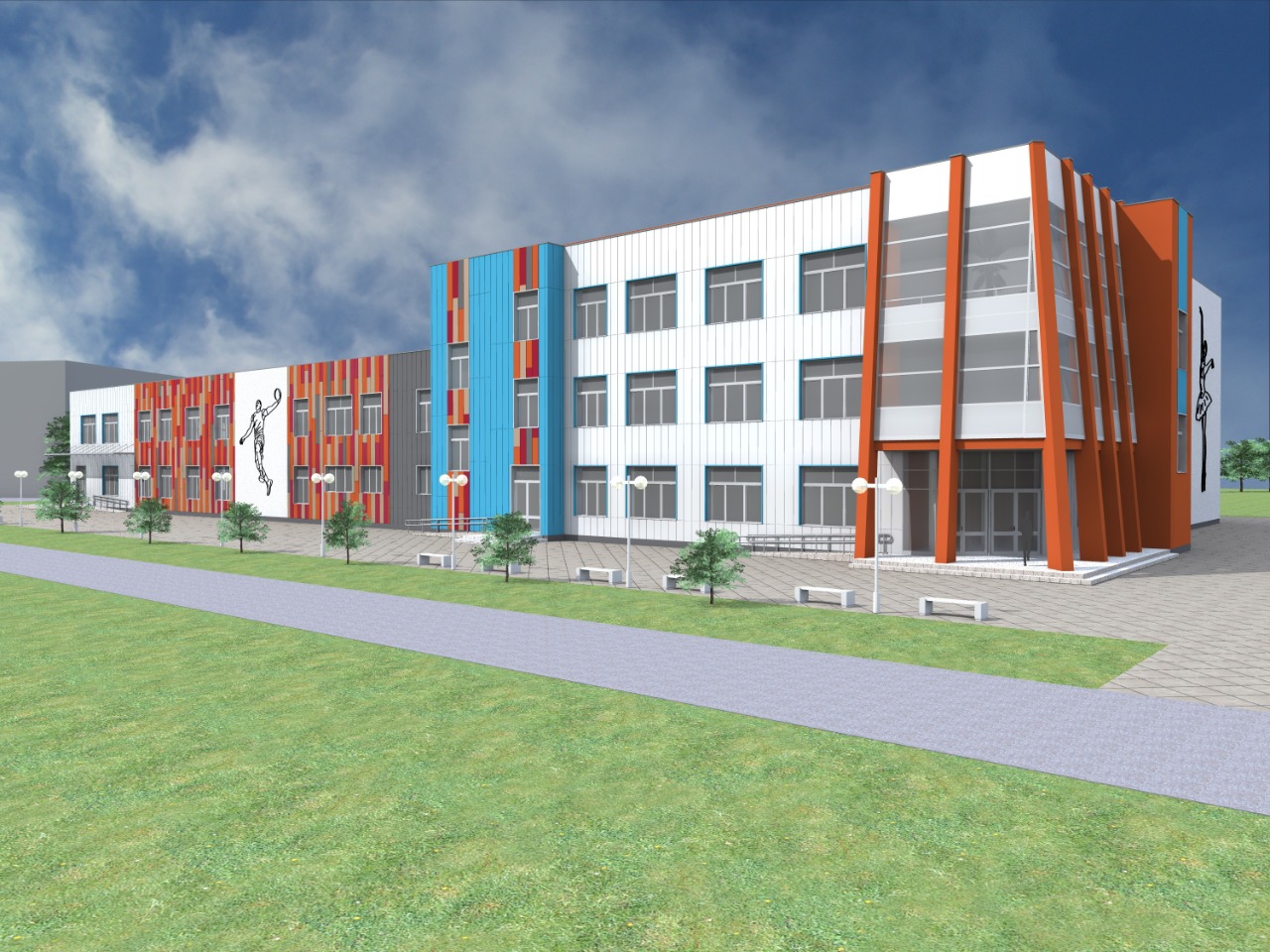 Спортивной группе помещений предназначена двухэтажная часть здания. Здесь разместятся зал для спортивных игр, раздевалки с душевыми и санузлами, комнаты для инвентаря, кабинеты судей, тренеров и врача. В этой же части здания, на втором этаже, будут располагаться несколько помещений клубной группы: театральная студия с подсобным помещением, зал хореографии, многофункциональный зал.