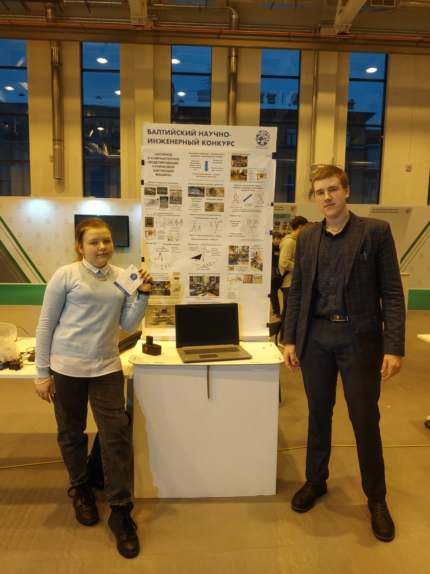 Первый проект: «Натурное и компьютерное моделирование кулачковой шагающей машины» в секции «Техника», авторы проекта — учащаяся 7 класса Гимназии № 5 г. Королев Московской области Анастасия Васильева и студент нашего техникума Сергей Николаев. Проект получил Диплом 2 степени и специальную премию научного жюри, а также специальный приз молодежного жюри от компании Astrolamp.