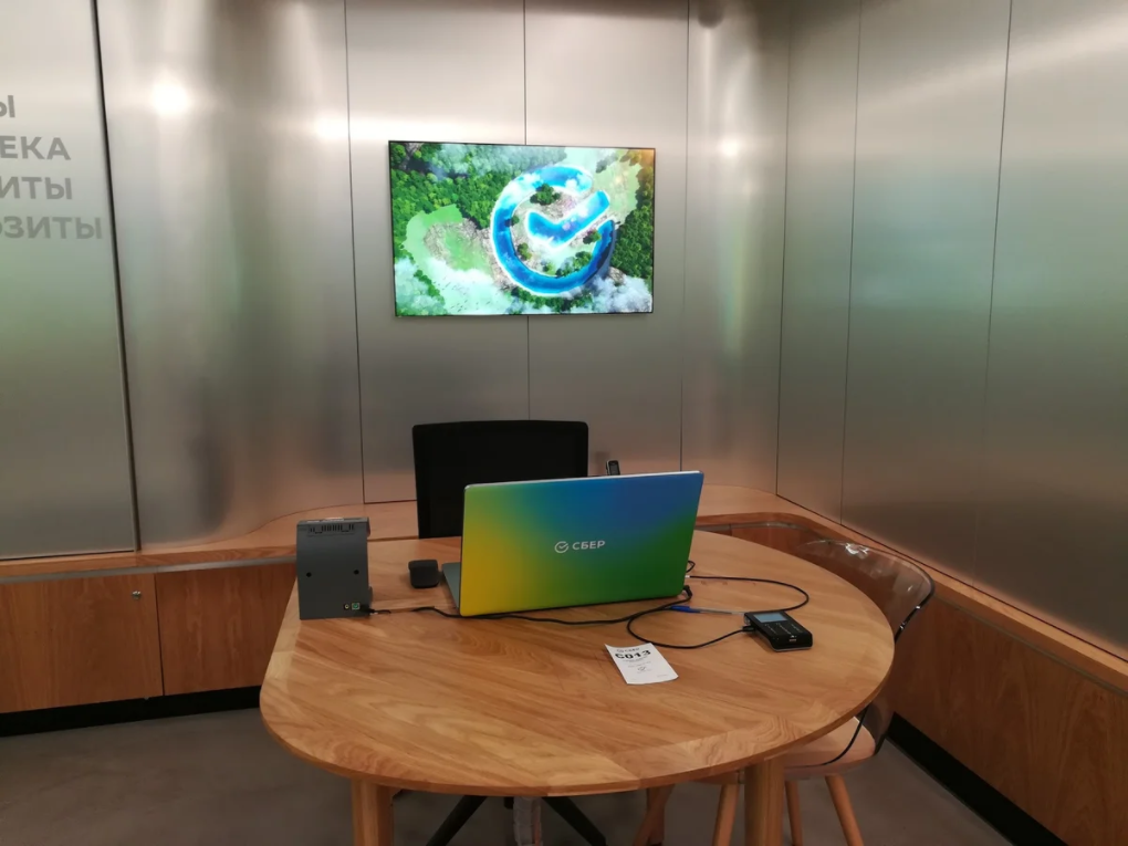 Наша героиня устанавливает Скайп, ей звонят, включается видео. На видео: женщина в белой блузке и зеленом шарфике, на фоне настоящий офис: стоят кабинки, ходят люди, в общем, полная имитация Сбера.