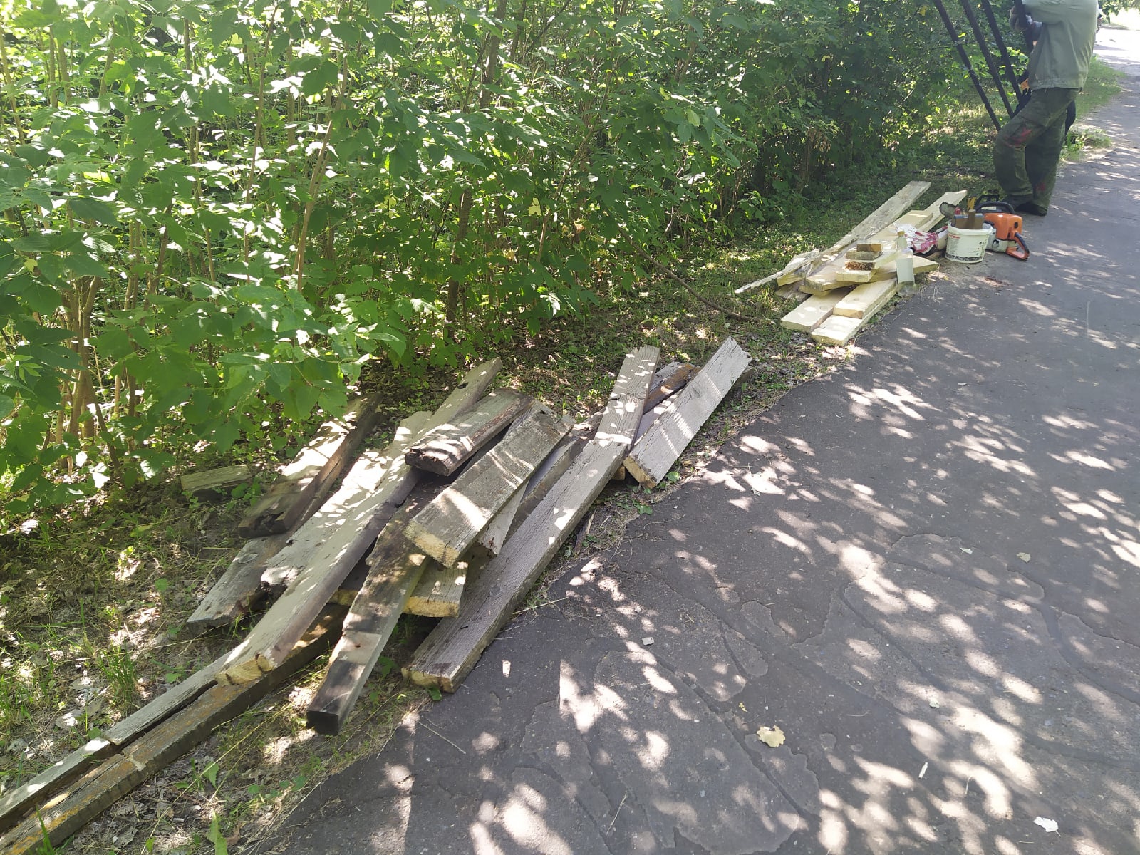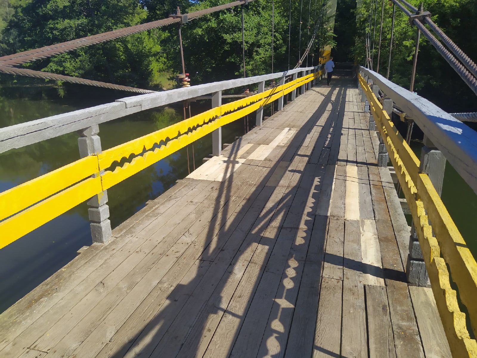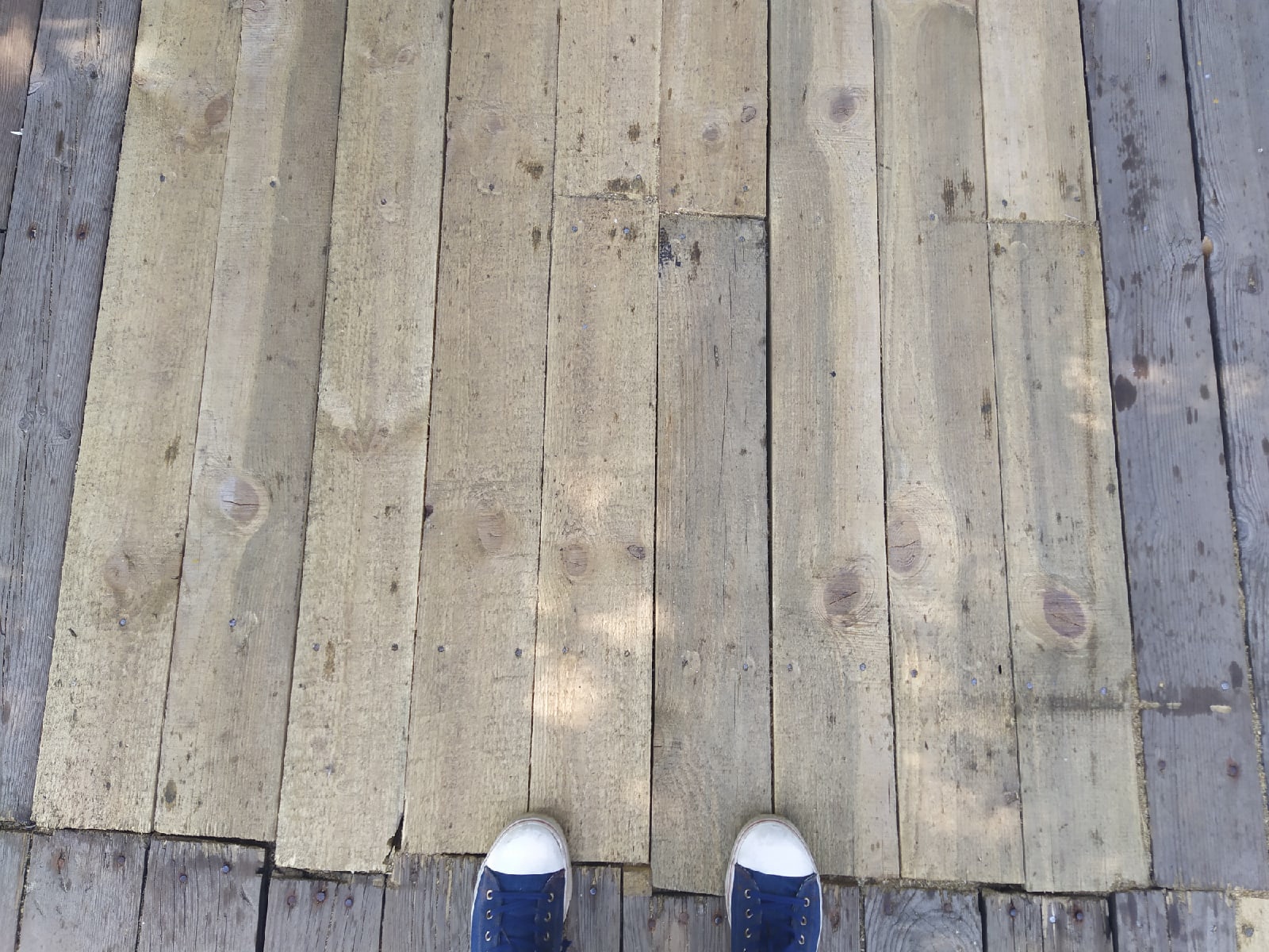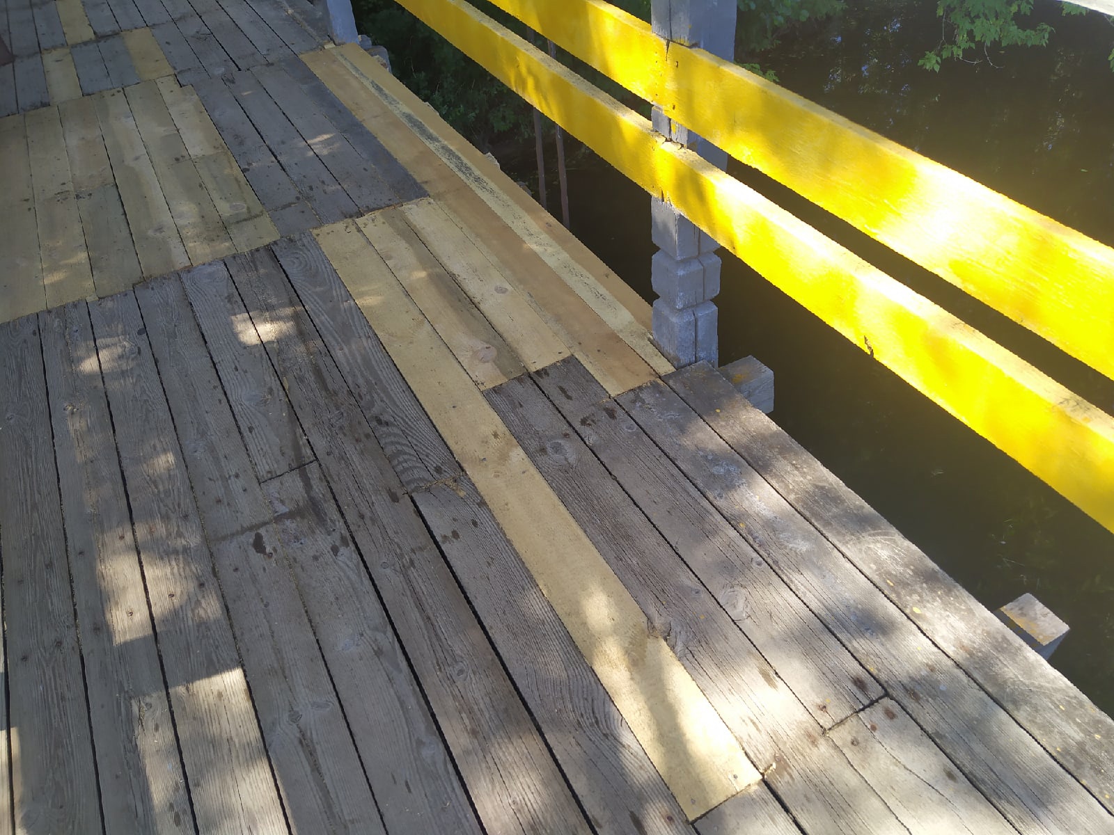 По уму, давно уже пора весь мост перестилать. Доски прогнили все, под ногой прогибаются, гвозди торчат. Хорошо, что пока никто не провалился. А новые доски надо было обработать пропиткой для долговечности.