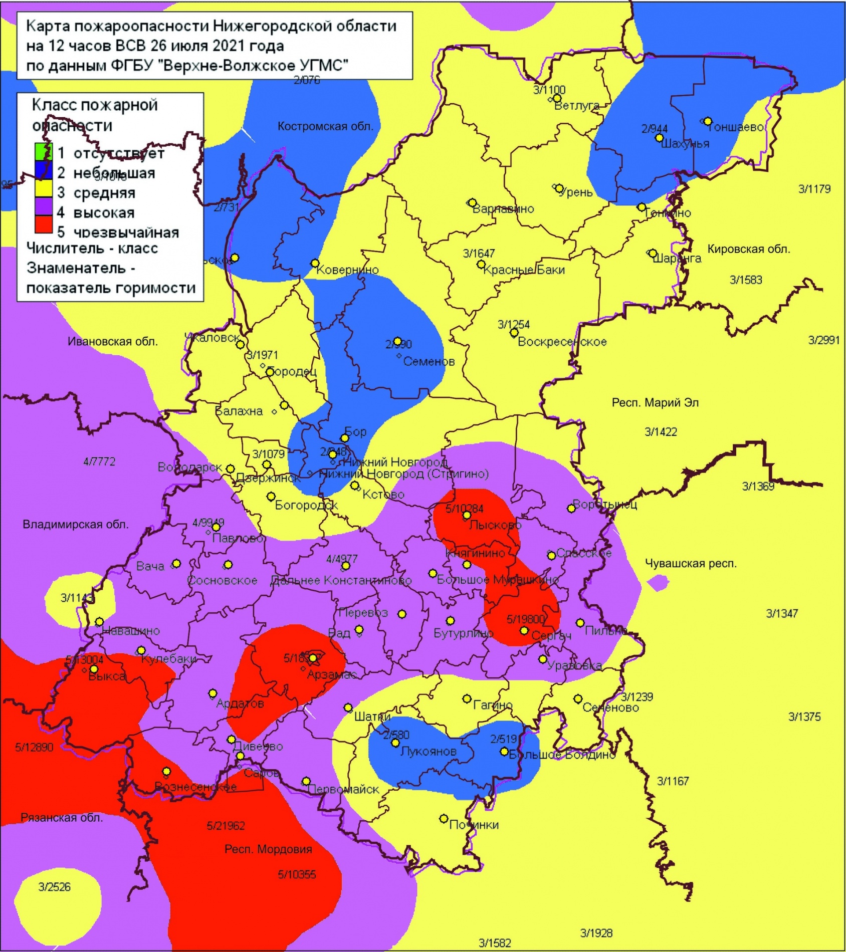 Частично 5-й класс пожароопасности лесов установился на территории 10 МО: г. о. г. Выкса, г. о. г. Кулебаки, г. о. г. Саров, Дивеевский м.о., Лысковский м.о., Ардатовский, Арзамасский, Вознесенский, Сергачский, Спасский районы.