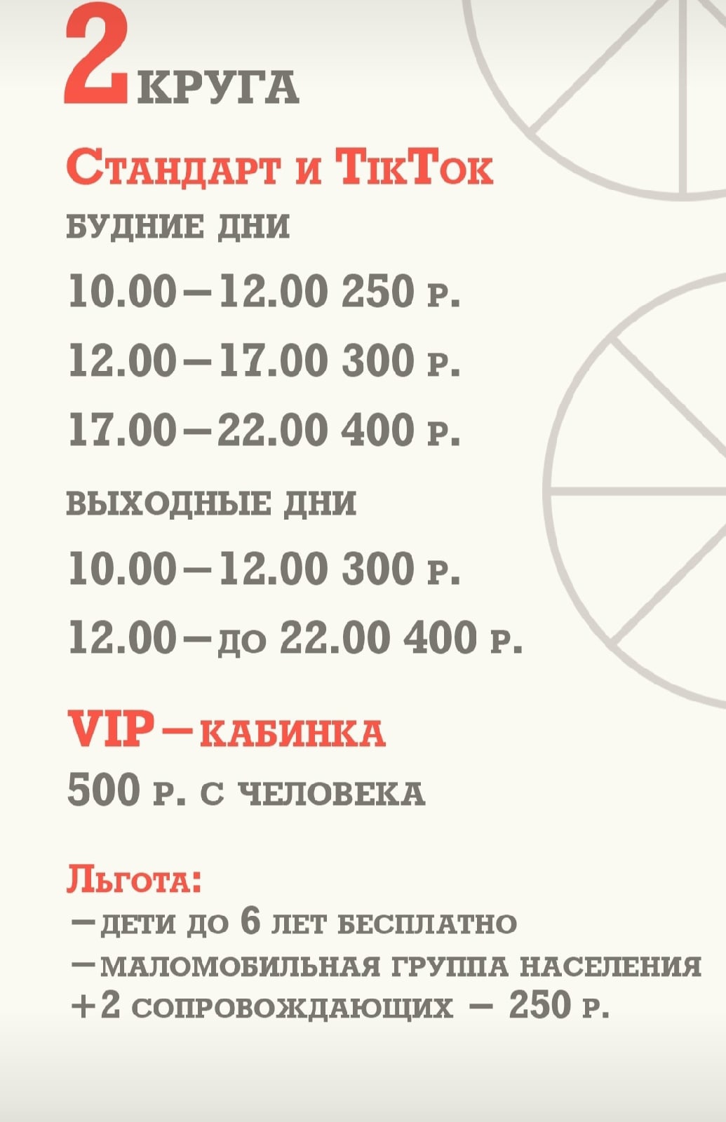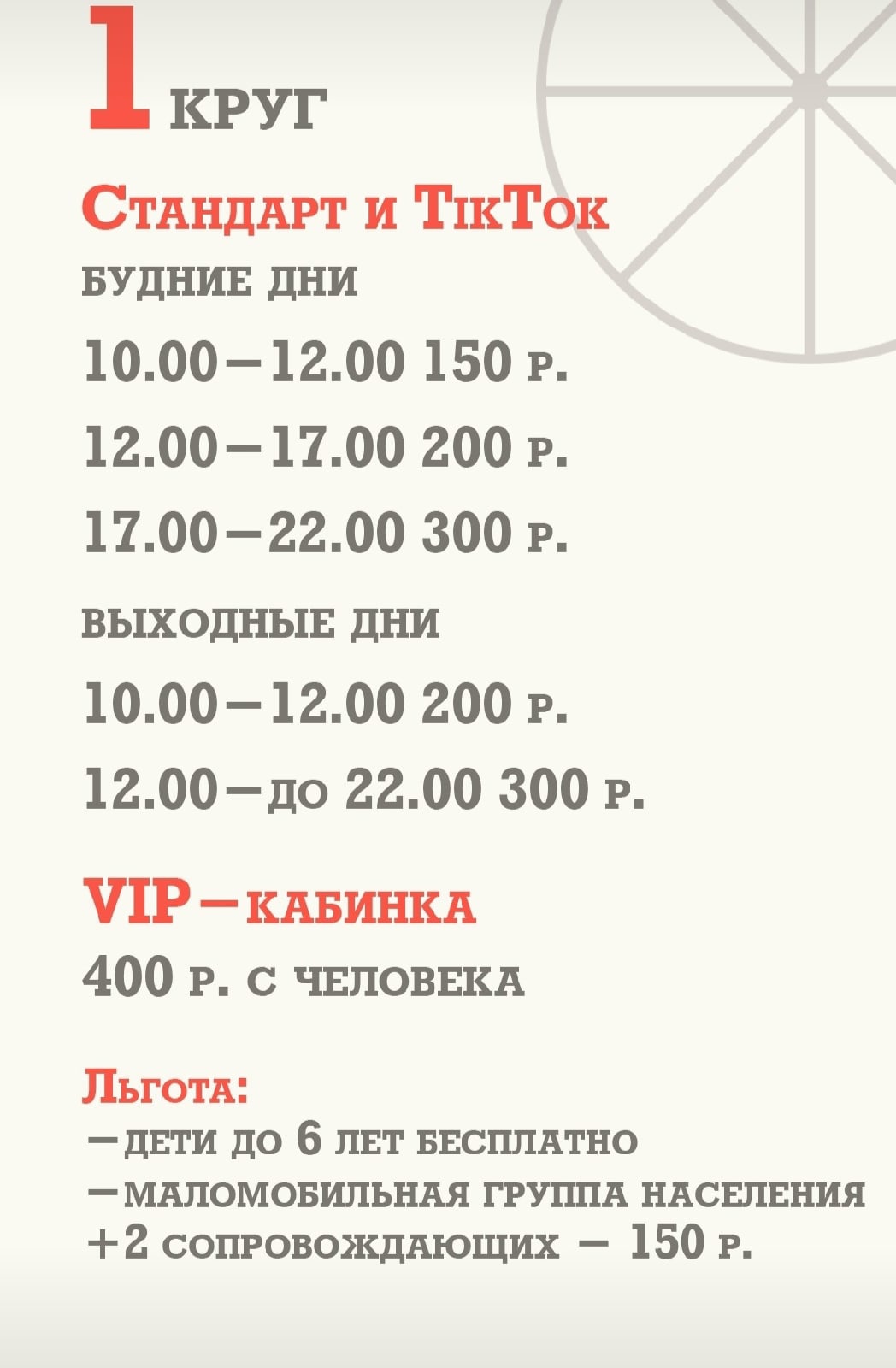 Цена будет зависеть от дня недели, времени суток и количества оборотов. Самый бюджетный вариант в будни за один оборот обойдется в 150 рублей, в выходные — 400 рублей за два оборота. Ночью — дешевле.