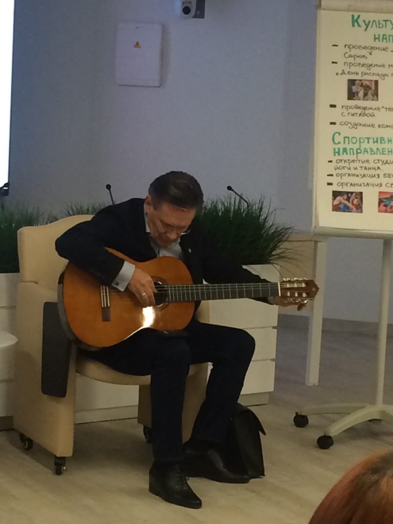 Вопросы обсудили самые разные, в том числе и о спортивном зале, о быте. А в конце встречи Алексей Евгеньевич подарил ребятам гитару. Теперь слово за студентами — на следующей встрече гитара просто обязана зазвучать.