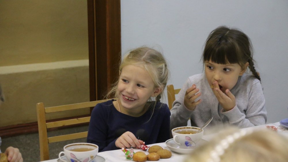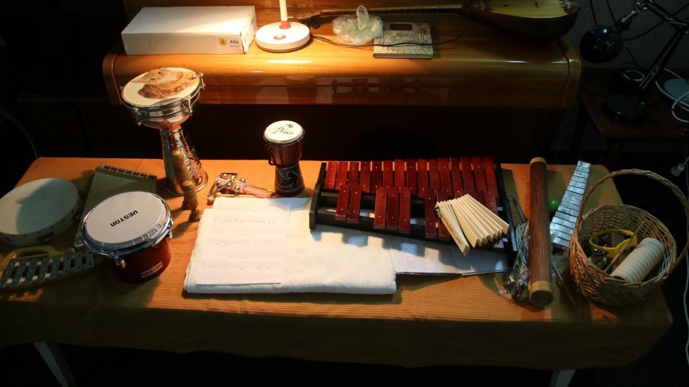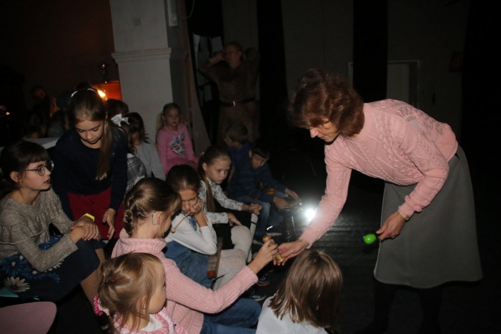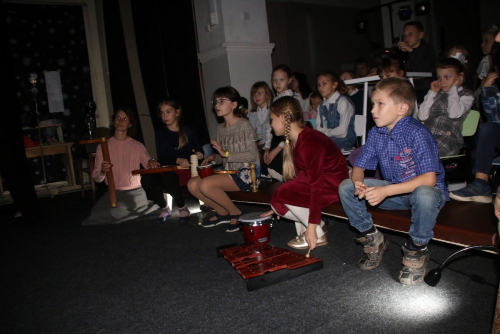 Дети собрались на сцене, приготовили музыкальные инструменты. Погас свет. Стали крутить ручку старого доброго диапроектора, и на заднике сцены появились картинки. Были взяты две народные сказки: грузинская — «Шапка, полная дэвов» и финская — «Жемчужина Адальмины». Хорошие сказки, где герои совершают добрые и злые поступки, и есть что обсудить с детьми.