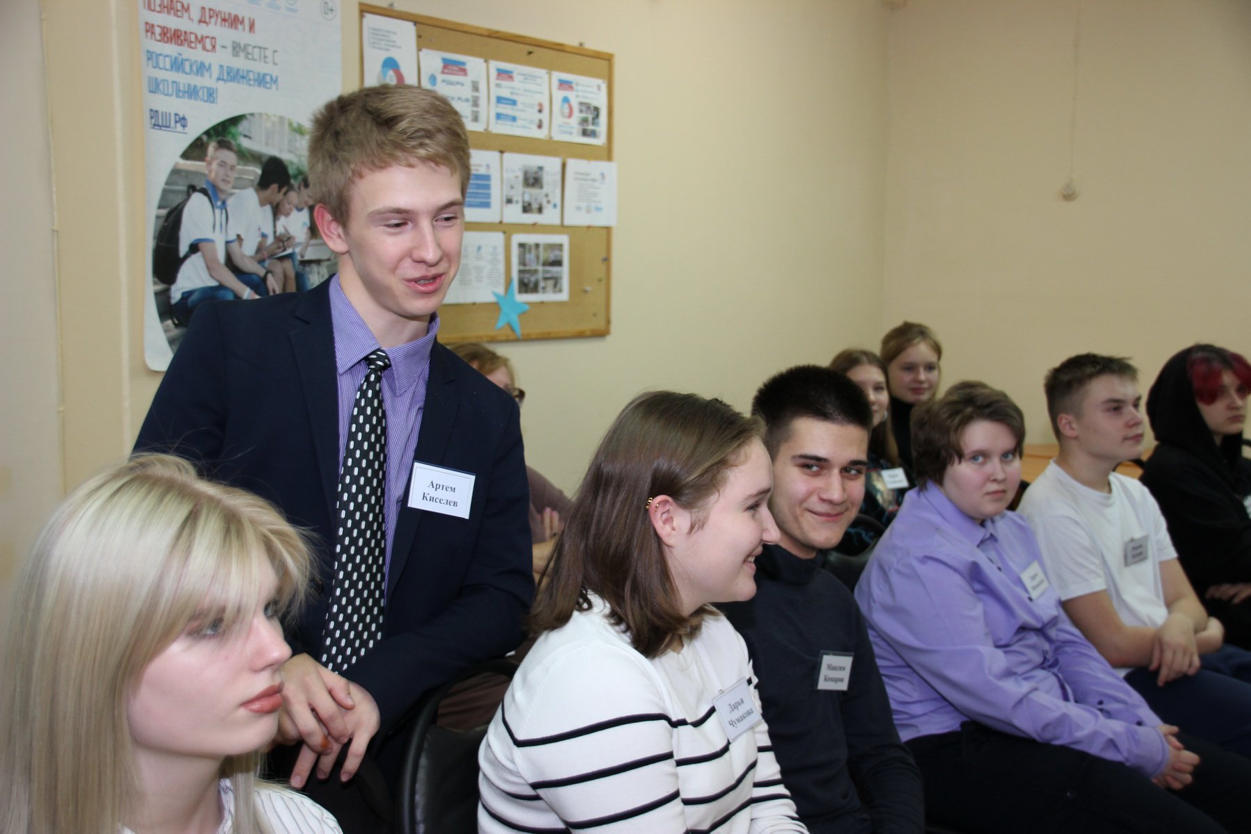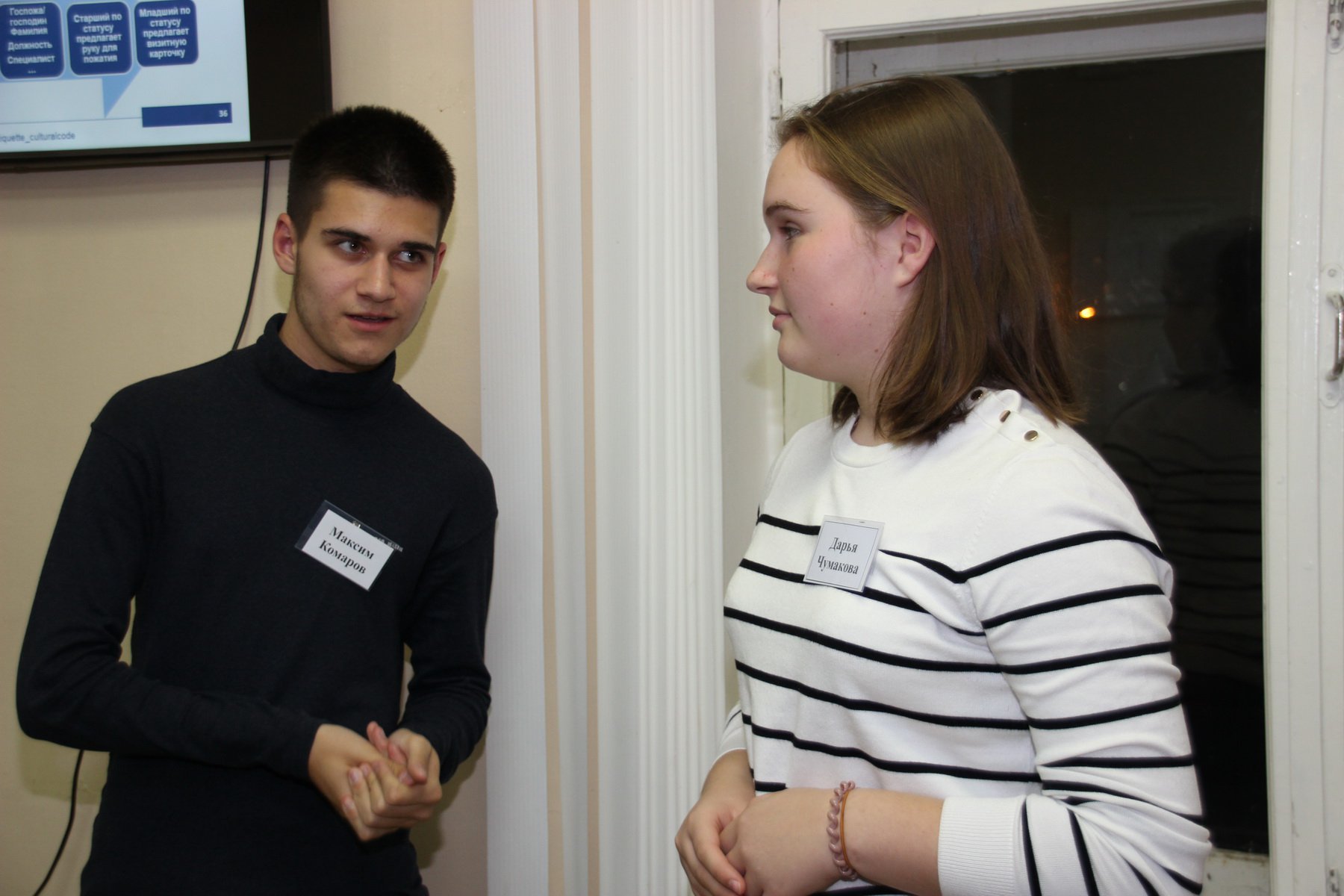 18 октября у ребят была возможность попрактиковаться, разыгрывая ситуации деловой встречи и неформального общения. Оказывается, не так просто сформулировать, а потом в нужном темпе, с правильной мимикой и жестикуляцией назвать имя, фамилию и сказать о себе самое главное в одной фразе. Еще сложнее познакомить разных людей между собой и сделать это так, чтобы у них появилась тема для дальнейшей беседы.
