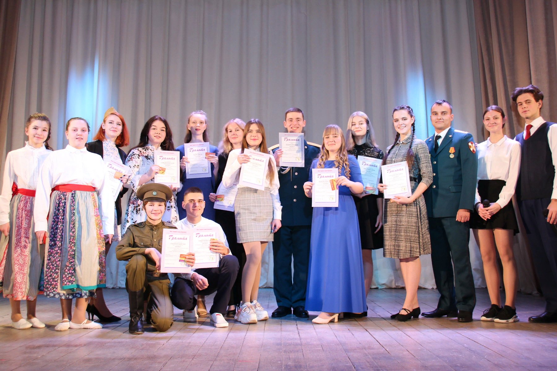 Великолепные Алина Тавторкина из школы № 5), Анастасия Голякова и Екатерина Торопова из школы № 17 (все они — солистки студии «Звездопад» Дворца детского творчества) покорили слушателей удивительно красивыми голосами, широтой диапазона и артистичностью. Виктория Сергеева из школы-интерната № 1, Максим Комаров из школы № 11 и Ксения Афонина из школы № 14 пели строго и собранно, словно проживая с героями трагические эпизоды войны и послевоенного времени. Владислав Глазков из школы № 16 и его танцующая группа поддержки заразили зал своим задором. А мечтательная, с чудесным сопрано, похожая на принцессу Диана Зубова добавила лиричности.
