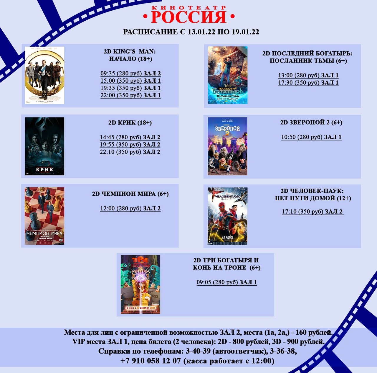 Афиша кинотеатра «Россия» с 13 по 19 января