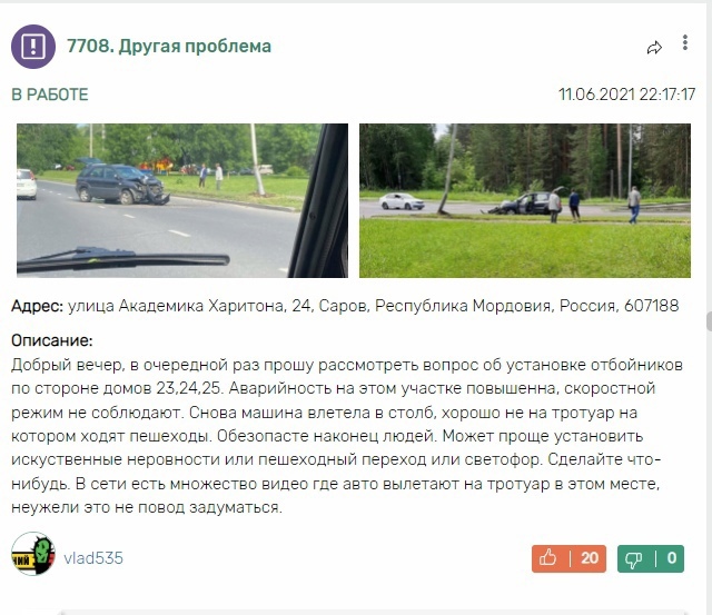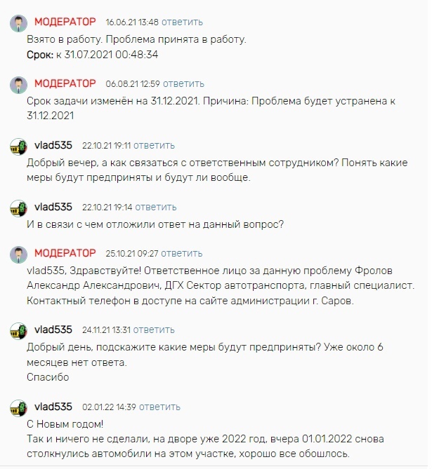 На сайте «Умный Саров» уже в течение полугода жителю не отвечают на вопрос по поводу отбойников на ул. Академика Харитона, хотя сами же поставили срок
