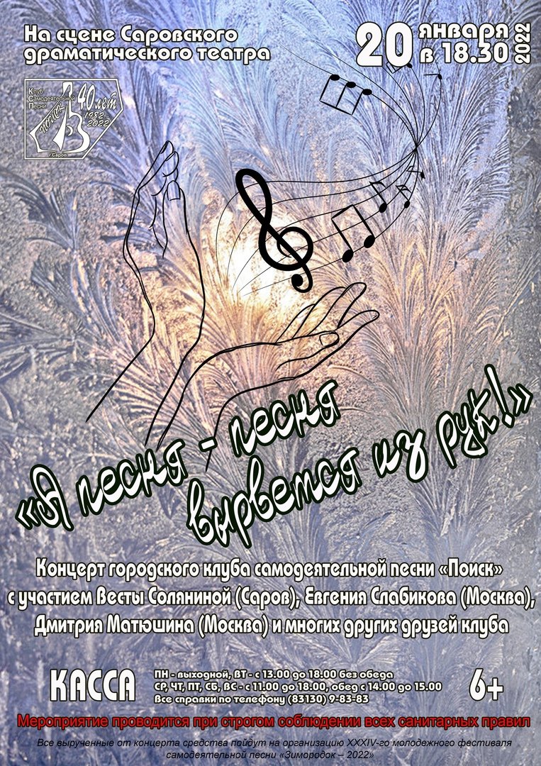 20 января в 18:30 на сцене Саровского театра состоится концерт бардовской песни «А песня — песня вырвется из рук!». Этот концерт традиционный, много лет проходил в Доме учёных. Сейчас проводится на новой площадке. Концерт устраивает городской клуб самодеятельной песни «Поиск».