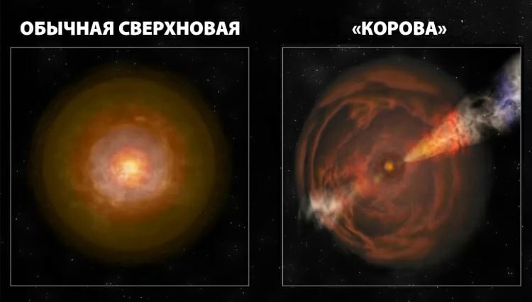 Космические «коровы» — это открытый в 2018 году подкласс сверхновых, которые образуются, когда гигантские звёзды достигают конца своей жизни и разрушаются, вызывая при этом мощные взрывы. В зависимости от исходного размера звезды, в результате взрыва сверхновой может образоваться чёрная дыра или нейтронная звезда.